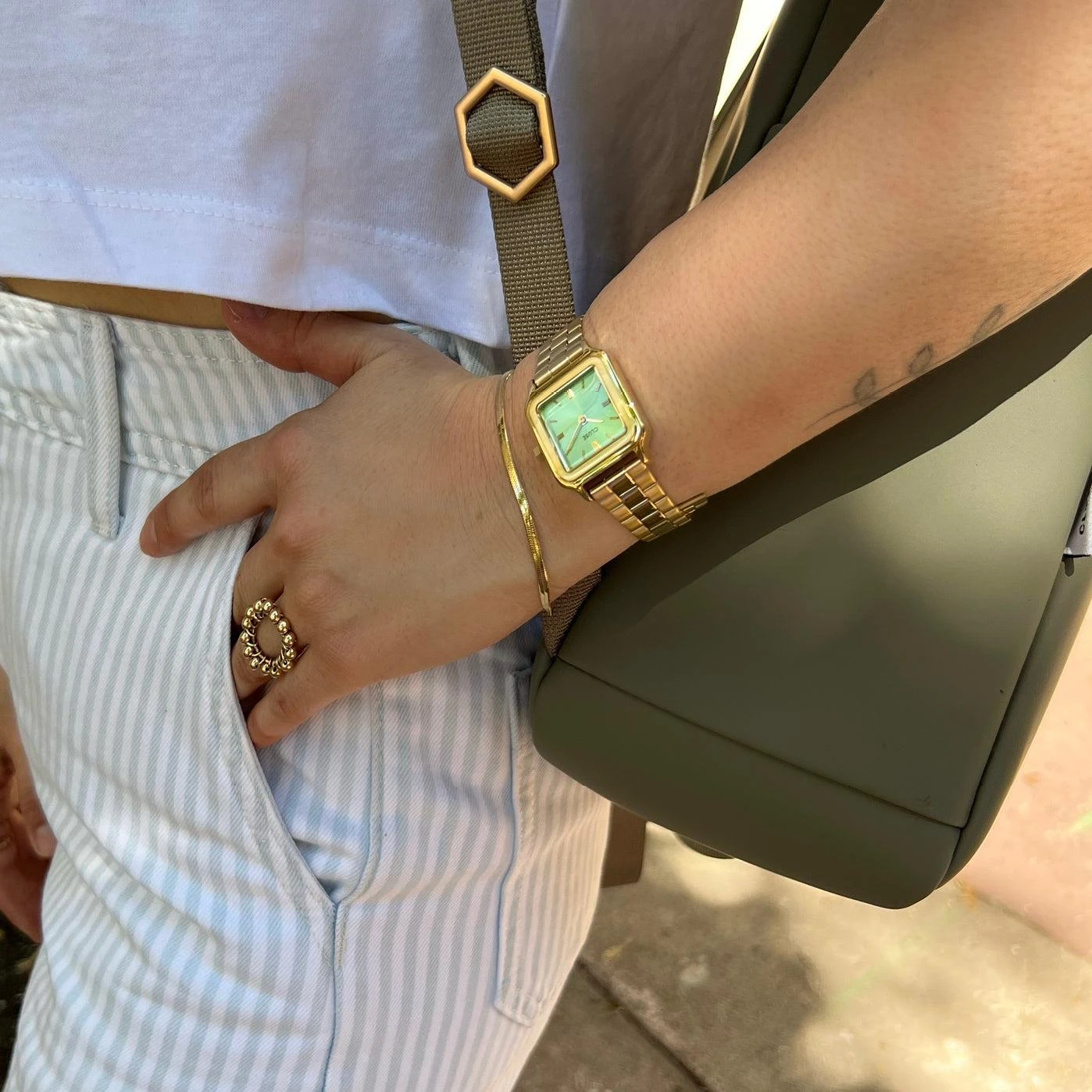 Женские часы Gracieuse Petite квадратной формы имеют корпус золотистого цвета диаметром 24 мм, светло-зеленый циферблат и ремешок из нержавеющей стали золотистого цвета шириной 14 мм. Легко персонализируйте свои часы с помощью любого ремешка CLUSE шириной 14 мм.