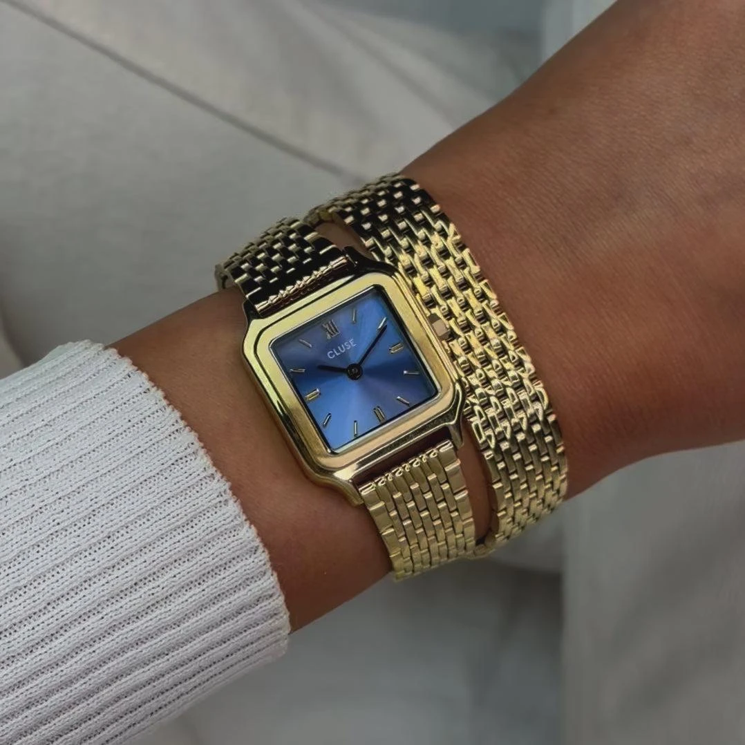 Квадратные женские часы Gracieuse Petite имеют корпус золотистого цвета диаметром 24 мм, циферблат цвета кианита и двойной ремешок из нержавеющей стали золотистого цвета шириной 14 мм. Легко персонализируйте свои часы с помощью любого ремешка CLUSE шириной 14 мм.