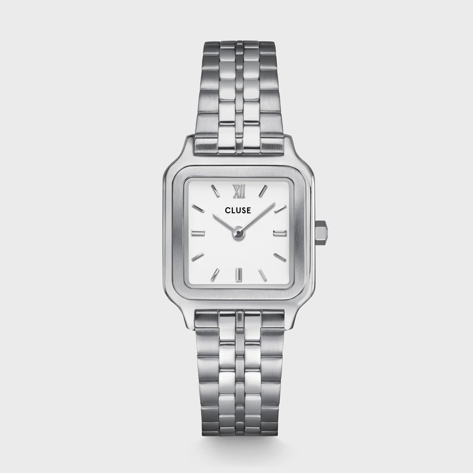 Женские часы Gracieuse Petite в серебристом корпусе квадратной формы (24 мм). Модель дополнена классическим белым циферблатом и серебристым браслетом из нержавеющей стали шириной 14 мм.