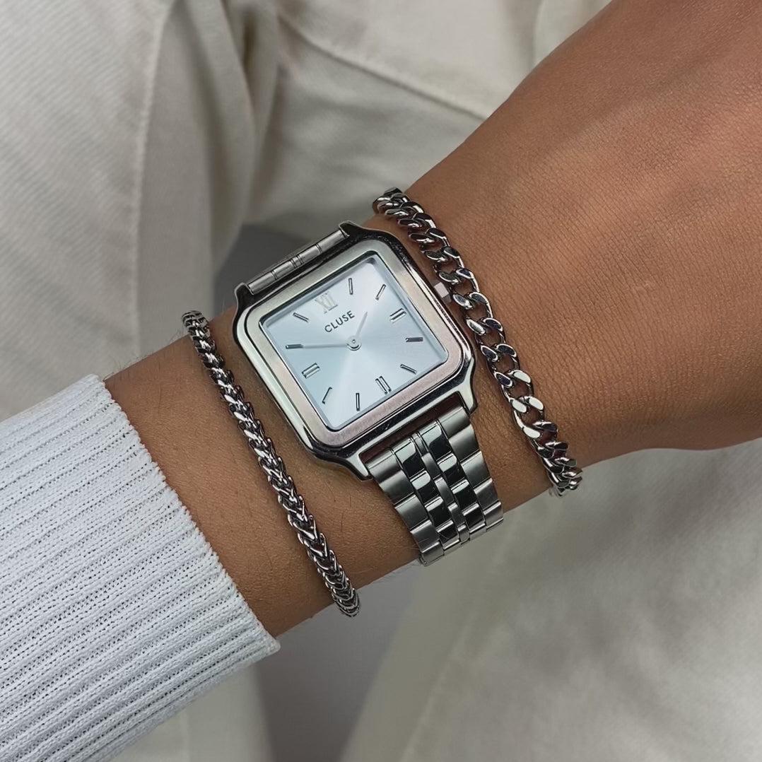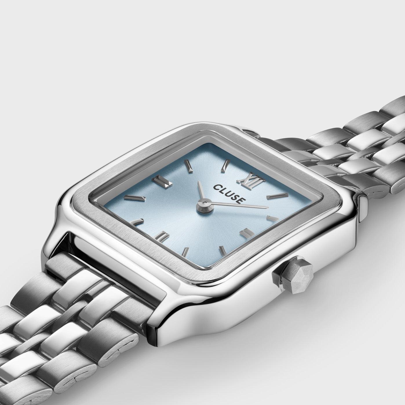 Женские часы Gracieuse квадратной формы имеют корпус серебристого цвета диаметром 28 мм, светло-голубой циферблат и серебристый ремешок из нержавеющей стали шириной 16 мм с пятью звеньями. Легко персонализируйте свои часы с помощью любого ремешка CLUSE шириной 16 мм.
