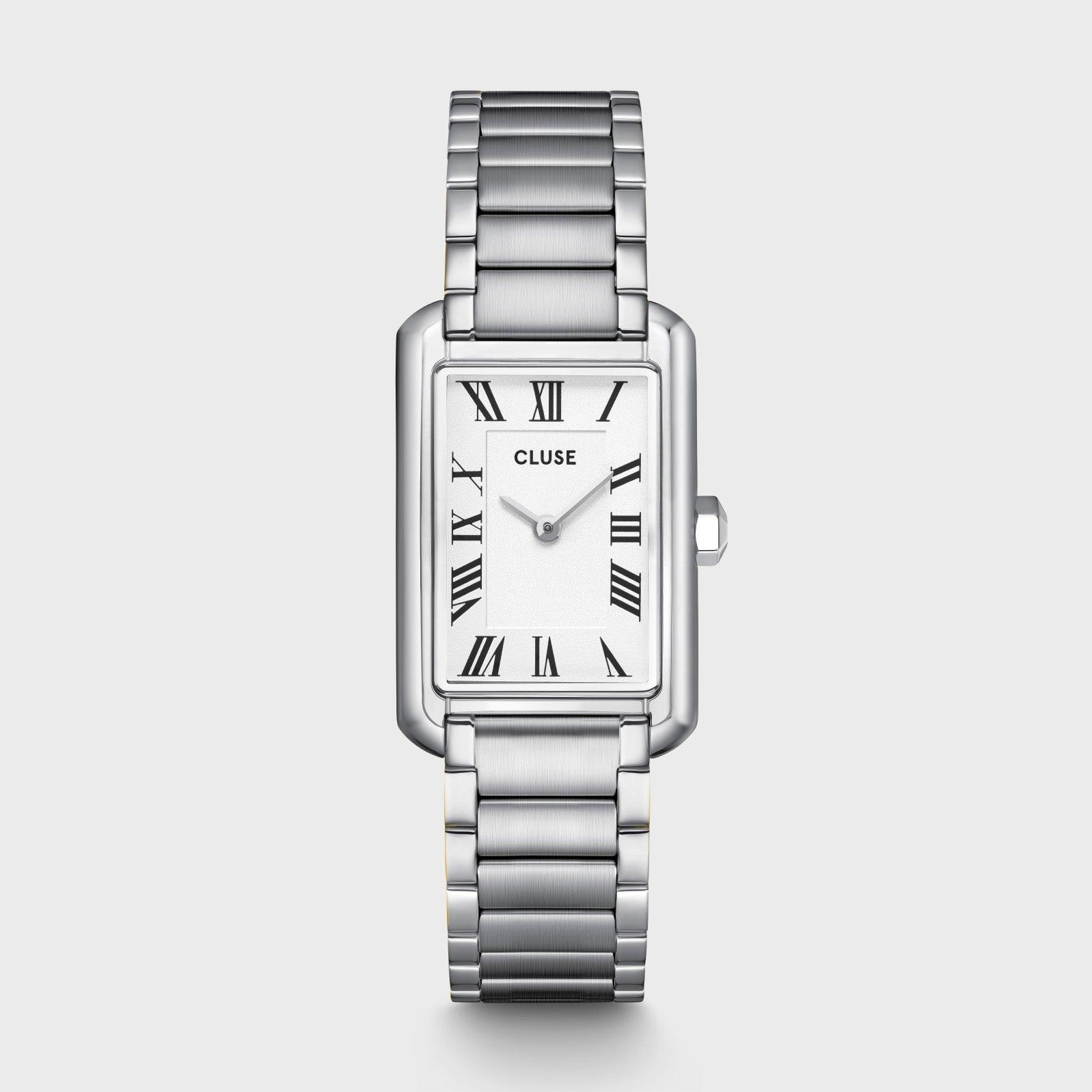 Женские часы Belisenna прямоугольной формы имеют корпус серебристого цвета диаметром 21 мм, белый циферблат в винтажном стиле и серебристый ремешок из нержавеющей стали шириной 14 мм с тремя звеньями. Легко персонализируйте свои часы с помощью любого ремешка CLUSE шириной 14 мм.
