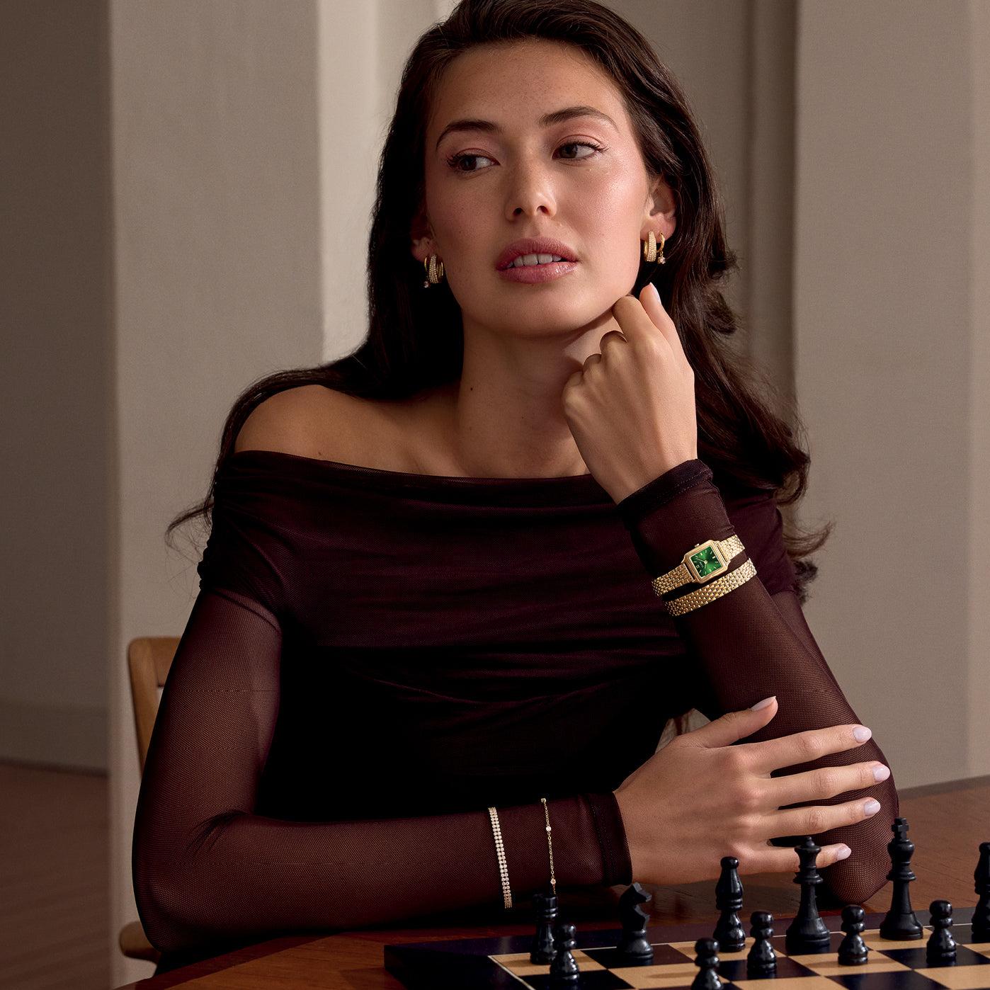 Квадратные женские часы Gracieuse Mini имеют корпус золотистого цвета диаметром 21 мм, циферблат лесного зеленого цвета и двойной ремешок из нержавеющей стали золотистого цвета шириной 12 мм.