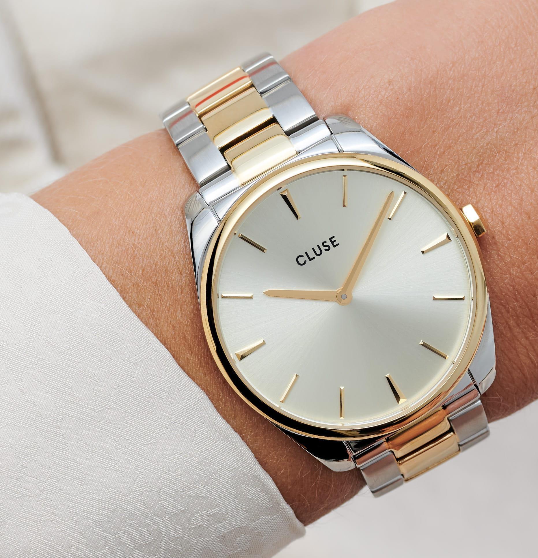 <b>Женские наручные часы Cluse Feroce CW0101212004.</b> Точный кварцевый механизм с аналоговой индикацией. Корпус изготовлен из высококачественной нержавеющей стали 316L с высокими антикоррозийными свойствами. Браслет из нержавеющей стали. Прочное, устойчивое к царапинам минеральное стекло защищает часы от повреждений. Часы являются водонепроницаемыми до 5 Бар. Цвет корпуса: Серебристый. Цвет циферблата: Золотистый. Ширина (с заводной головкой): 36мм. Толщина: 7мм. Гарантия: 2 года.