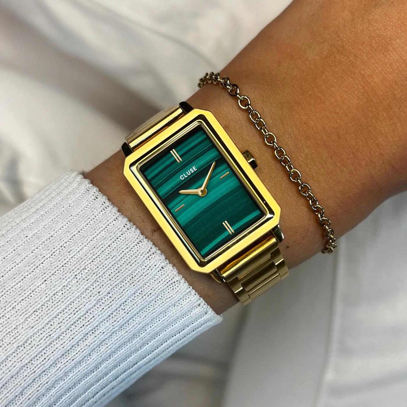 Этот подарочный набор CLUSE Fluette (арт. CG11506) включает кварцевые часы в прямоугольном корпусе из нержавеющей стали размером 30.6 x 24 мм при толщине всего 7,4 мм. Модель оснащена кварцевым механизмом, защищена минеральным стеклом и обладает водонепроницаемостью 5 ATM. Золотистое покрытие нанесено методом PVD, обеспечивающим высокую износостойкость, а темно-зеленый циферблат с эффектом солнечных лучей и фактурой под малахит создает глубокий визуальный акцент. Стальной браслет шириной 14 мм дополнен удобной застежкой-клипсой, а входящий в комплект ювелирный браслет с плетением «роло» и круглыми звеньями регулируется по длине, обеспечивая идеальную посадку на запястье.