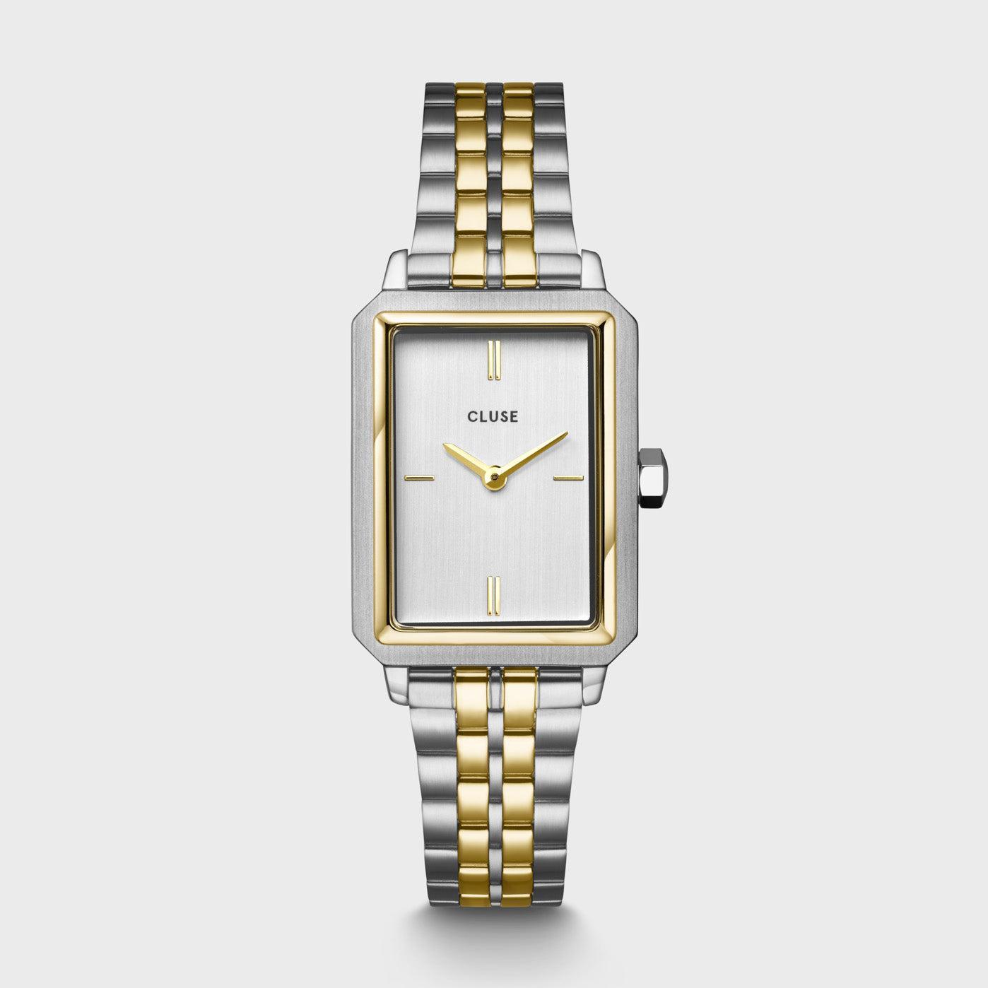 Женские часы Fluette прямоугольной формы имеют корпус золотого и серебристого цветов диаметром 30,6 мм, белый матовый циферблат и 5-звенный ремешок из нержавеющей стали золотого и серебристого цветов шириной 14 мм. Легко персонализируйте свои часы с помощью любого ремешка CLUSE шириной 14 мм.