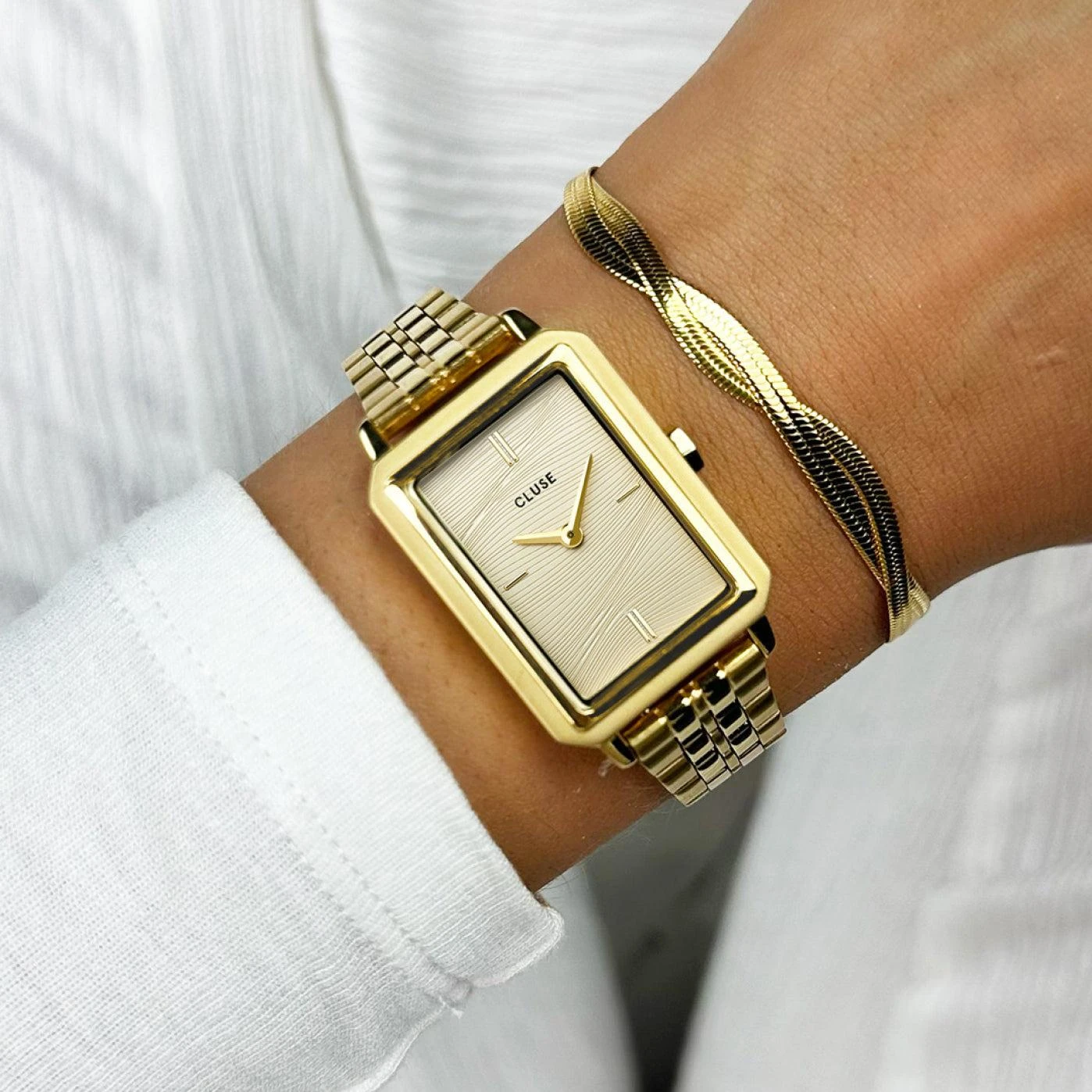 Женские часы Fluette прямоугольной формы имеют корпус золотистого цвета диаметром 30,6 мм, циферблат золотистого цвета с песочной текстурой и ремешок из нержавеющей стали золотистого цвета шириной 14 мм. Легко персонализируйте свои часы с помощью любого ремешка CLUSE шириной 14 мм