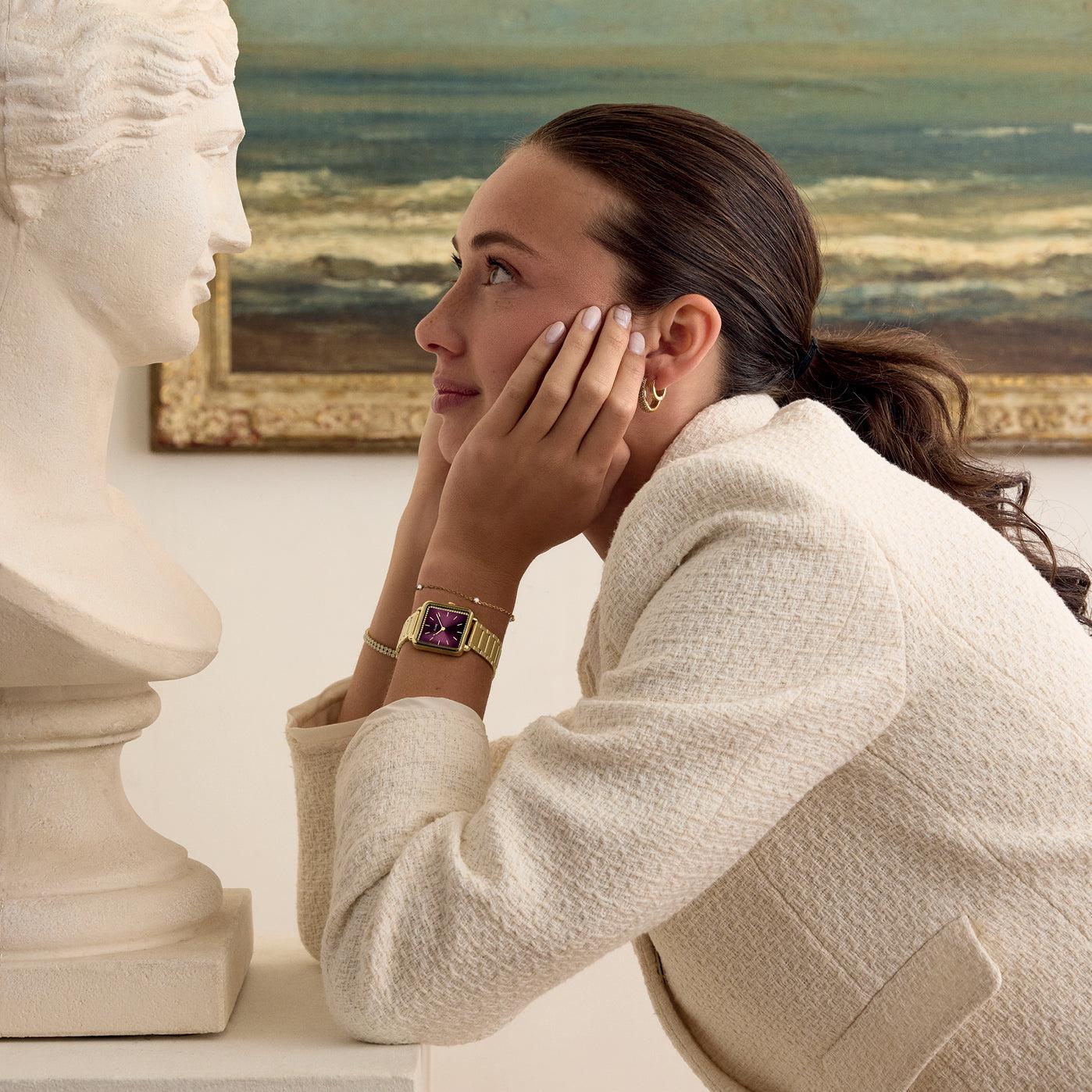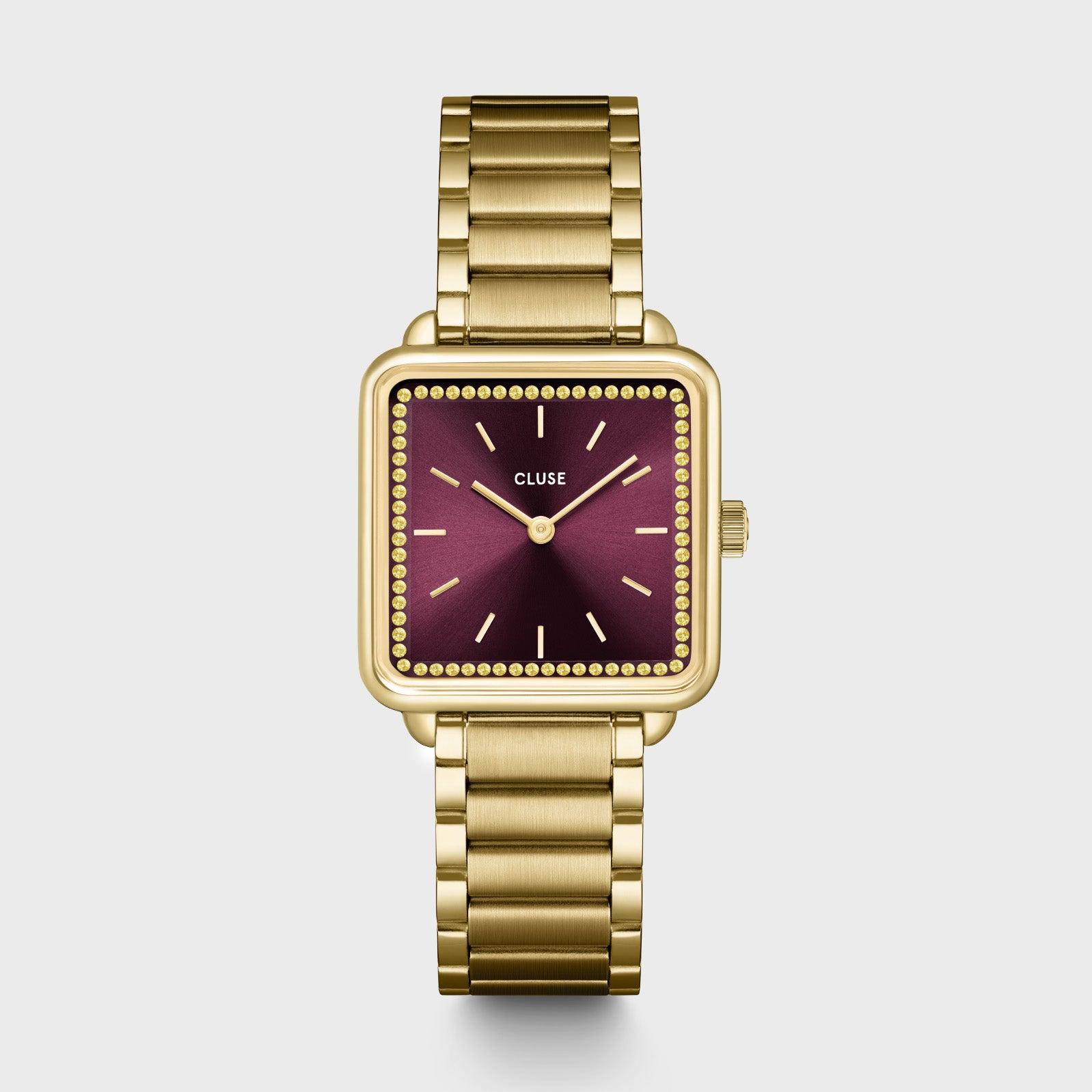 Женские часы La T?tragone Square имеют корпус золотистого оттенка диаметром 28,5 мм, винно-красный циферблат с золотистыми камнями и браслет из нержавеющей стали золотистого оттенка шириной 16 мм. Вы можете легко персонализировать свои часы с помощью любого браслета CLUSE шириной 16 мм.