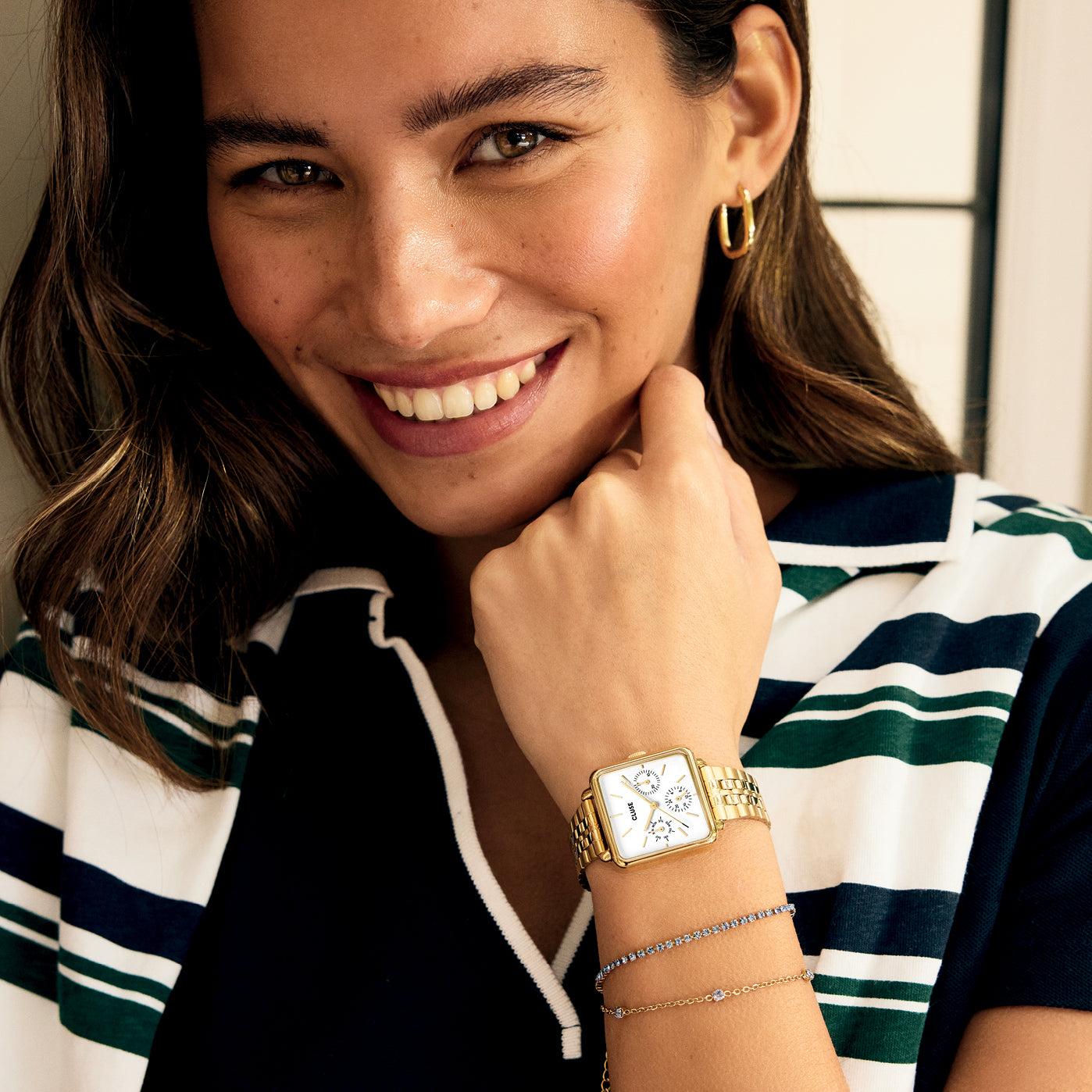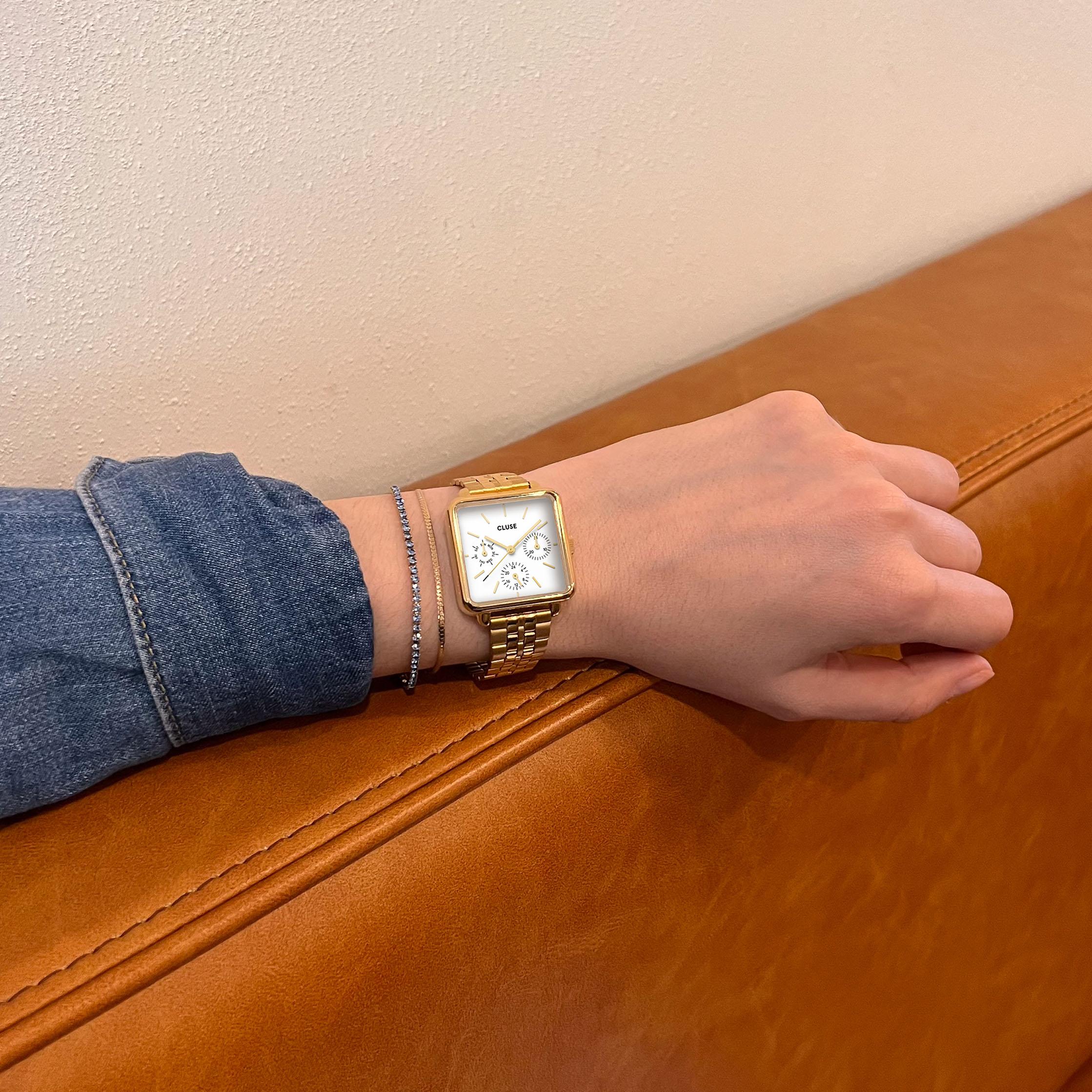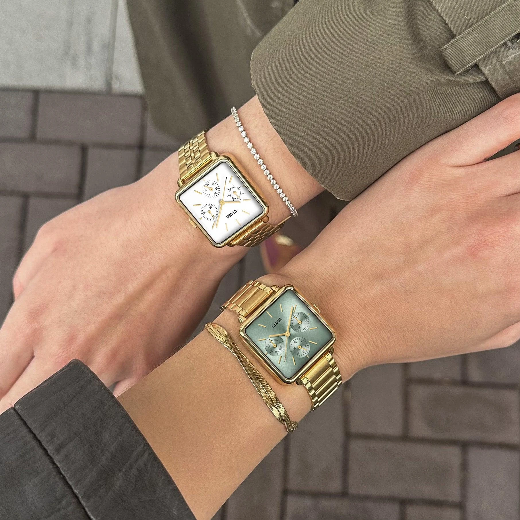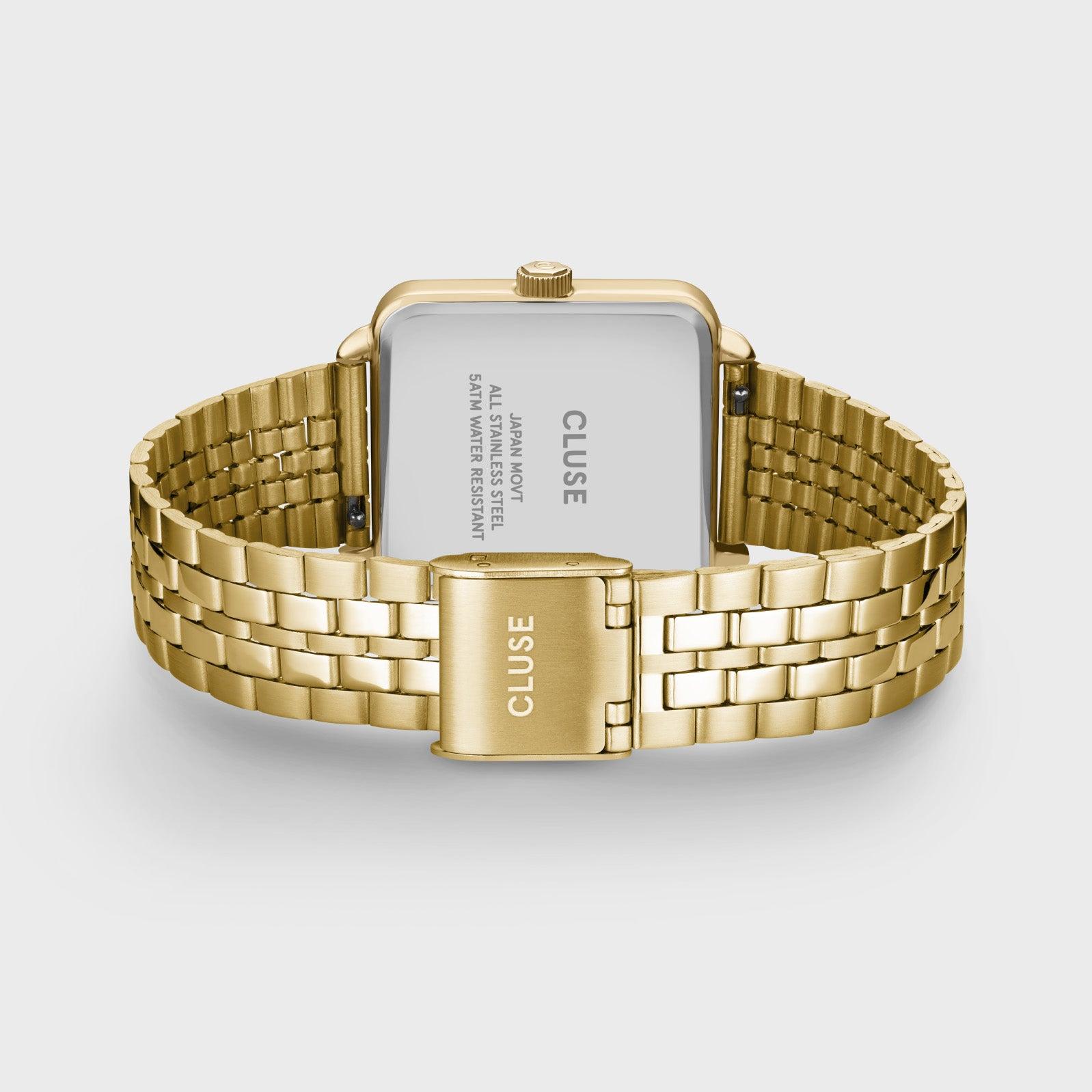 Квадратные многофункциональные часы La T?tragone для женщин имеют корпус золотистого цвета диаметром 30 мм, белый циферблат и 5-звеньевой ремешок из нержавеющей стали золотистого цвета шириной 16 мм. Легко персонализируйте свои часы с помощью любого ремешка CLUSE шириной 16 мм.