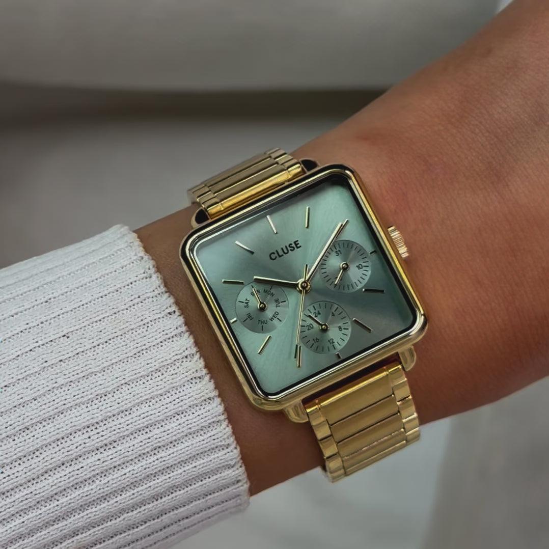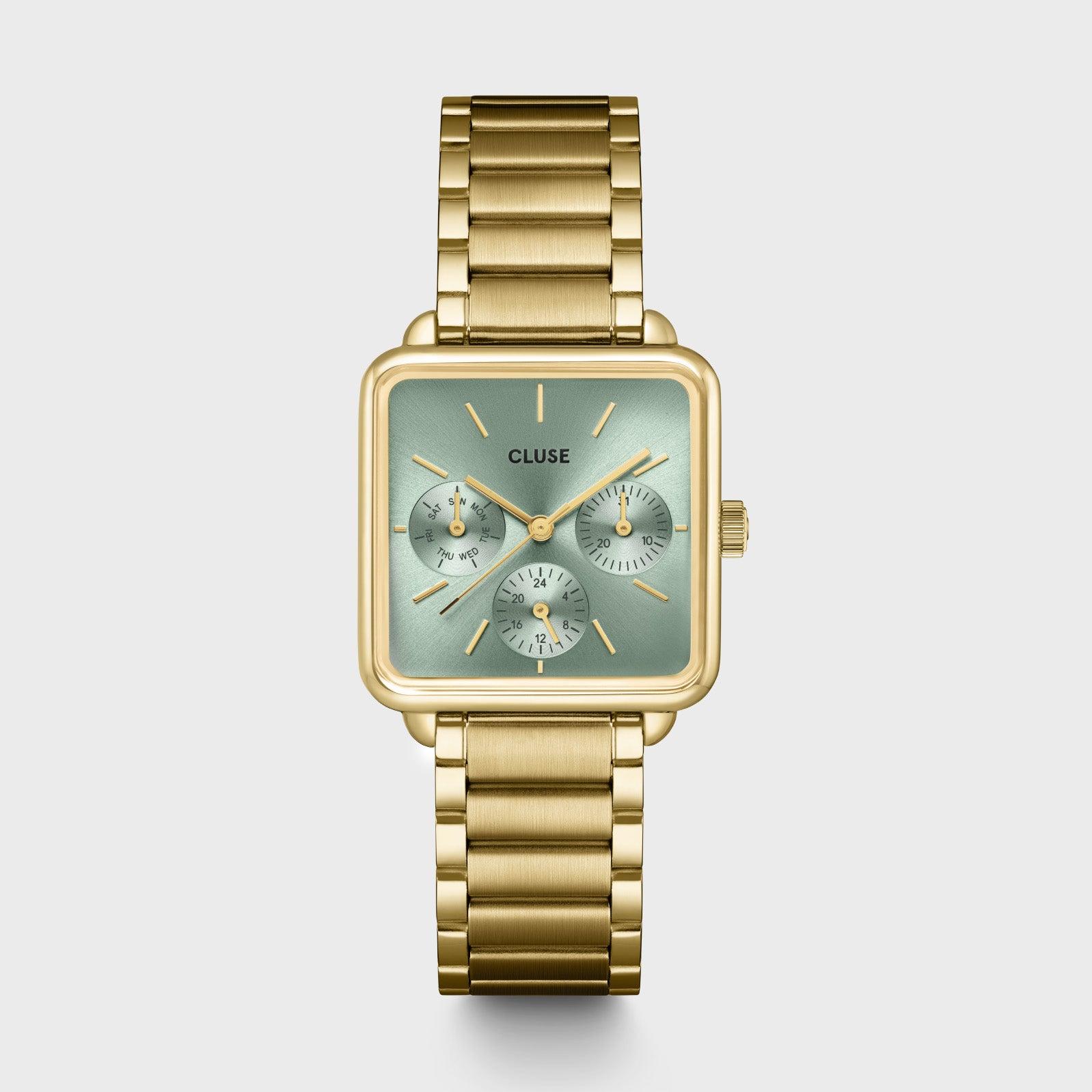 Женские часы La T?tragone Multifunction квадратной формы имеют корпус золотистого цвета диаметром 30 мм, циферблат цвета шалфея и трехзвенный ремешок из нержавеющей стали золотистого цвета шириной 16 мм. Легко персонализируйте свои часы с помощью любого ремешка CLUSE шириной 16 мм.