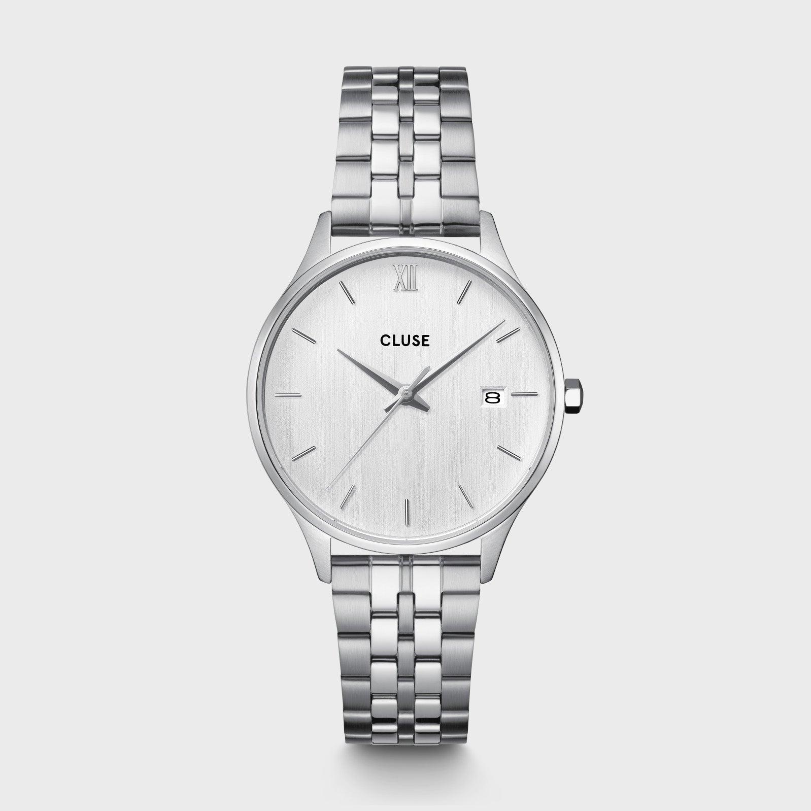Круглые женские часы Minuit Date имеют 34-миллиметровый серебристый корпус, серебристый циферблат и 16-миллиметровый серебристый 5-звенный ремешок из нержавеющей стали. Легко персонализируйте свои часы с помощью любого ремешка CLUSE шириной 16 мм.