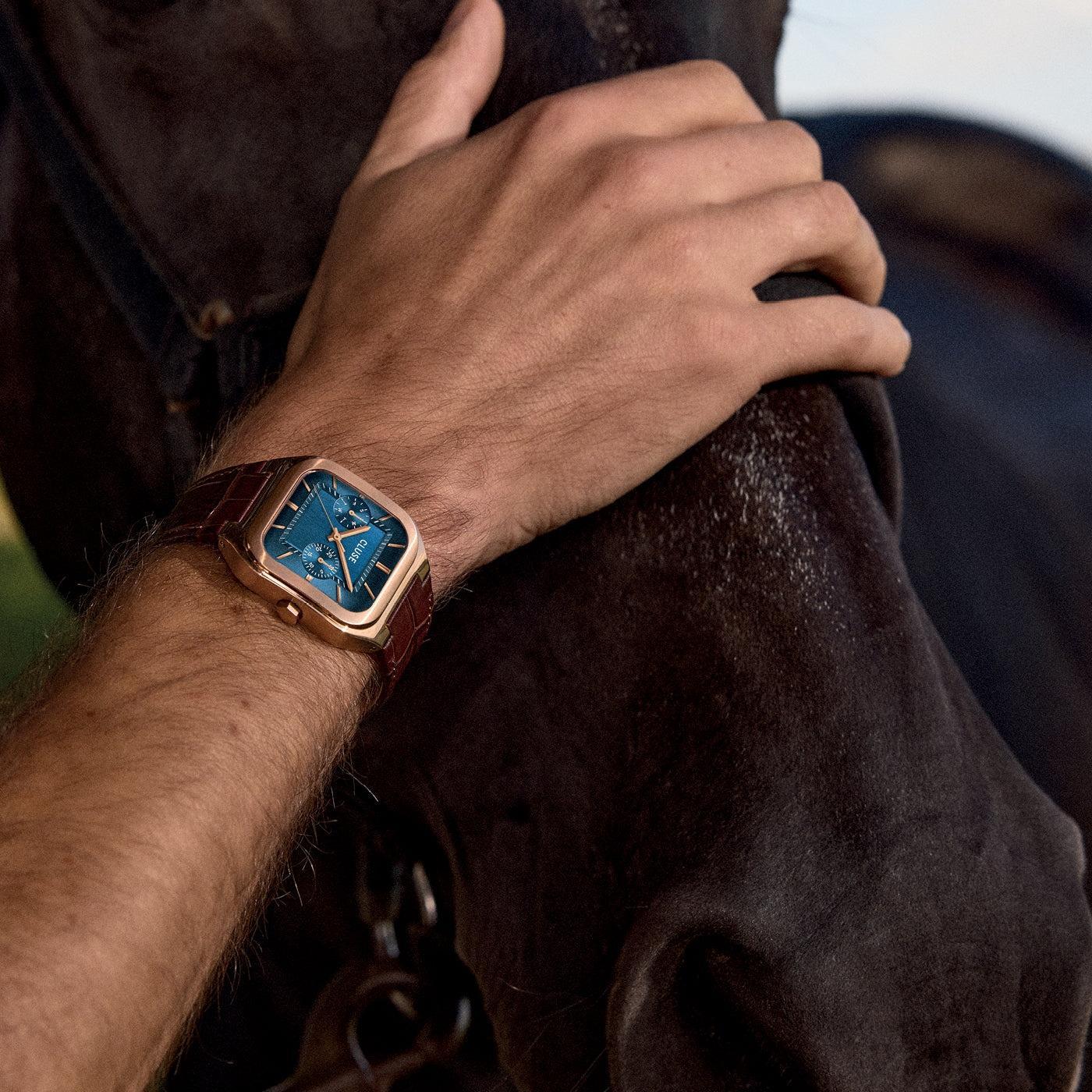 . Точный кварцевый механизм с аналоговой индикацией. В отличие от механических часов, не требуют завода и работают от батареи, показывая отклонение всего несколько секунд в месяц. Ремешок изготовлен из кожи. Гибкость такого ремешка позволяет точно регулировать посадку часов на руке. Корпус изготовлен из высококачественной нержавеющей стали 316L с высокими антикоррозийными свойствами. Прочное, устойчивое к царапинам минеральное стекло защищает часы от повреждений. Часы являются водонепроницаемыми до 5 Бар. Цвет корпуса: Розовое золото. Цвет циферблата: Синий. Высота (с ушками): 41 мм. Толщина: 9 мм. Гарантия: 2 года.
