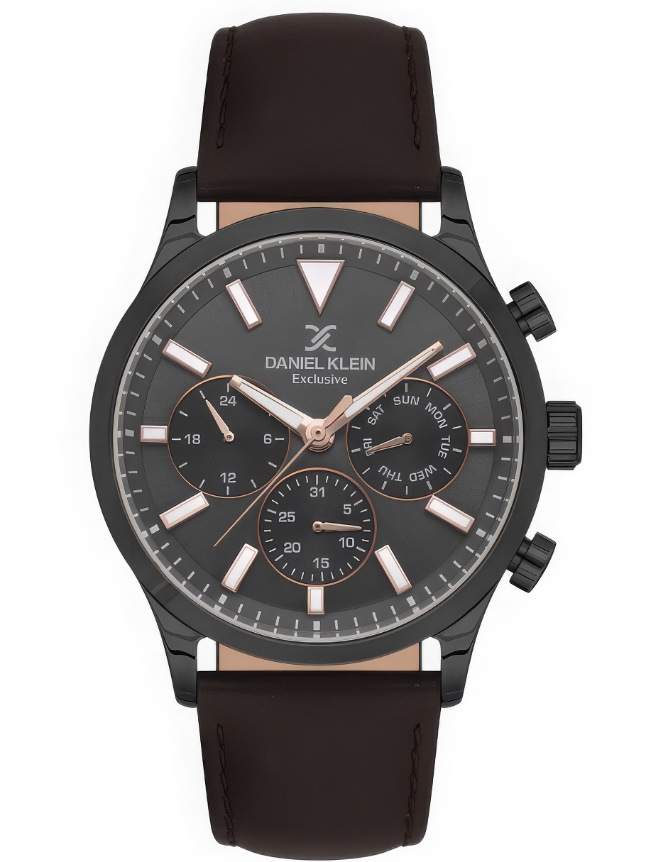 Мужские наручные часы Daniel Klein Exclusive 13745-5. Точный кварцевый механизм с аналоговой индикацией. Ремешок изготовлен из кожи. Функция хронографа. Браслет из нержавеющей стали. Прочное, устойчивое к царапинам минеральное стекло защищает часы от повреждений. На циферблате отображается текущее число месяца и день недели. Часы являются водонепроницаемыми до 5 Бар. Цвет циферблата: Черный. Цвет корпуса: Коричневый. На стрелки и отметки нанесен светонакопительный состав, благодаря этому считывать информацию с циферблата возможно и в темноте. Толщина: 10 мм. Гарантия: 1 год.