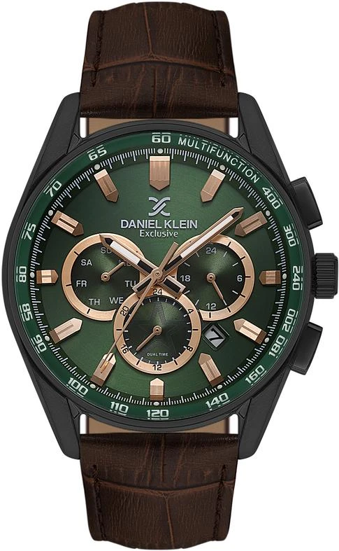 Мужские наручные часы Daniel Klein Exclusive 14002-5. Точный кварцевый механизм с аналоговой индикацией. В отличие от механических часов, не требуют завода и работают от батареи, показывая отклонение всего несколько секунд в месяц. На стрелки и отметки нанесен светонакопительный состав, благодаря этому считывать информацию с циферблата возможно и в темноте. Ремешок изготовлен из кожи. Гибкость такого ремешка позволяет точно регулировать посадку часов на руке. Функция хронографа. Отображение времени возможно в 12-часовом или 24-часовом формате. Корпус изготовлен из высококачественной часовой латуни с высокими антикоррозийными свойствами. Прочное, устойчивое к царапинам минеральное стекло защищает часы от повреждений. Часы являются водонепроницаемыми до 5 Бар. Цвет корпуса: Черный. Цвет циферблата: Зеленый. Высота (с ушками): 52 мм. Толщина: 13 мм. Гарантия: 1 год.