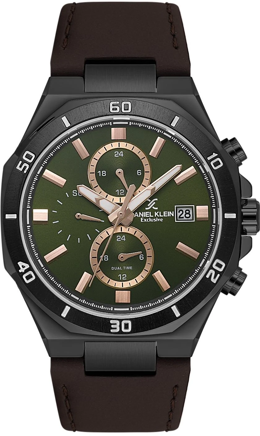 Мужские наручные часы Daniel Klein Exclusive 14003-4. Точный кварцевый механизм с аналоговой индикацией. В отличие от механических часов, не требуют завода и работают от батареи, показывая отклонение всего несколько секунд в месяц. На стрелки и отметки нанесен светонакопительный состав, благодаря этому считывать информацию с циферблата возможно и в темноте. Ремешок изготовлен из кожи. Гибкость такого ремешка позволяет точно регулировать посадку часов на руке. Функция хронографа. Отображение времени возможно в 12-часовом или 24-часовом формате. Корпус изготовлен из высококачественной часовой латуни с высокими антикоррозийными свойствами. Прочное, устойчивое к царапинам минеральное стекло защищает часы от повреждений. Часы являются водонепроницаемыми до 5 Бар. Цвет корпуса: Черный. Цвет циферблата: Зеленый. Высота (с ушками): 48.8 мм. Толщина: 12 мм. Гарантия: 1 год.