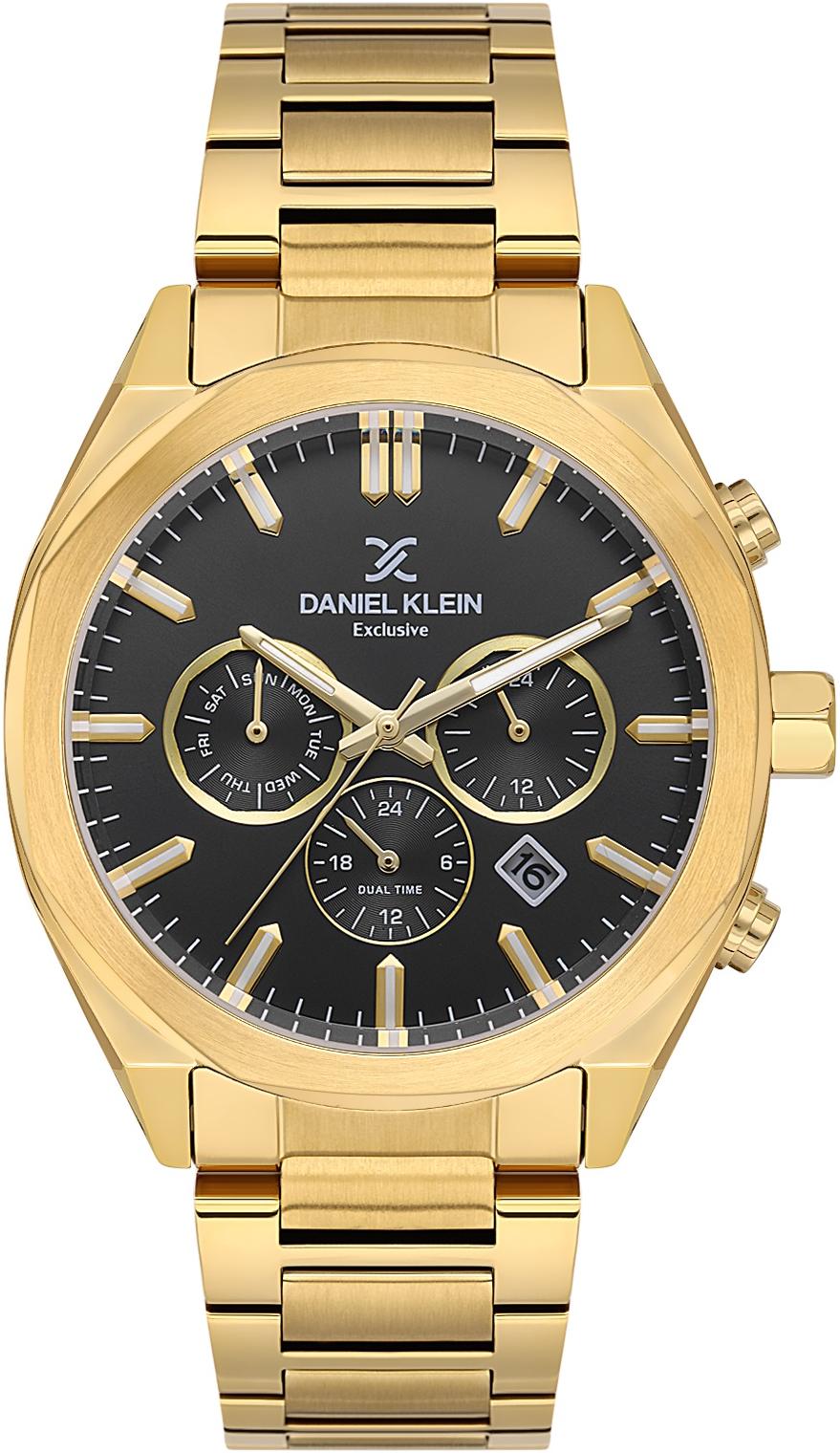 Мужские наручные часы Daniel Klein Exclusive 14064-5. Точный кварцевый механизм с аналоговой индикацией. В отличие от механических часов, не требуют завода и работают от батареи, показывая отклонение всего несколько секунд в месяц. На стрелки и отметки нанесен светонакопительный состав, благодаря этому считывать информацию с циферблата возможно и в темноте. Браслет из нержавеющей стали обладает высокой прочностью и износостойкостью, обеспечивая долговечность даже при активной эксплуатации. Материал устойчив к коррозии и сохраняет свой внешний вид надолго. Отображение времени возможно в 12-часовом или 24-часовом формате. Корпус изготовлен из высококачественной часовой латуни с высокими антикоррозийными свойствами. Прочное, устойчивое к царапинам минеральное стекло защищает часы от повреждений. Часы являются водонепроницаемыми до 5 Бар. Цвет корпуса: Желтое золото. Цвет циферблата: Черный. Высота (с ушками): 51 мм. Толщина: 12 мм. Гарантия: 1 год.