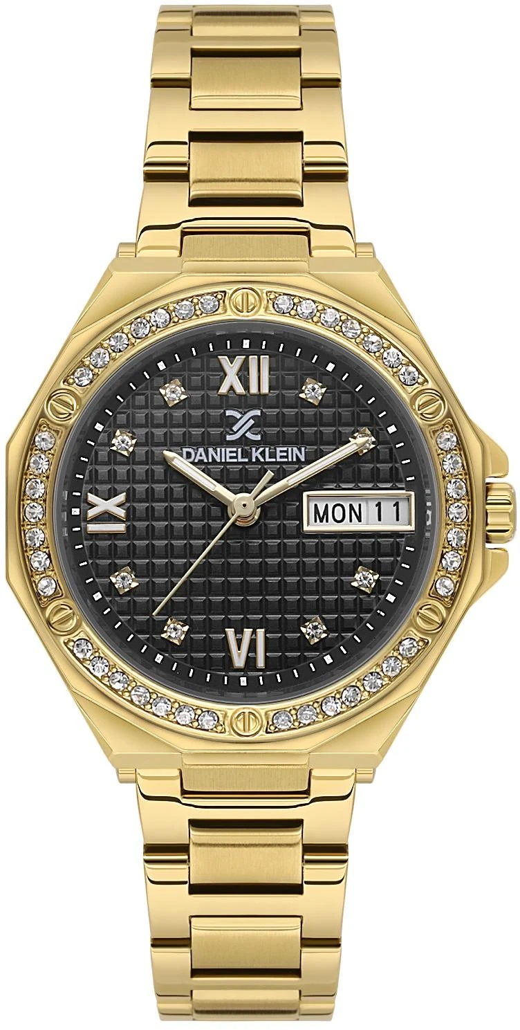 Женские наручные часы Daniel Klein Premium 13931-2. Точный кварцевый механизм с аналоговой индикацией. В отличие от механических часов, не требуют завода и работают от батареи, показывая отклонение всего несколько секунд в месяц. На стрелки и отметки нанесен светонакопительный состав, благодаря этому считывать информацию с циферблата возможно и в темноте. Браслет из нержавеющей стали обладает высокой прочностью и износостойкостью, обеспечивая долговечность даже при активной эксплуатации. Материал устойчив к коррозии и сохраняет свой внешний вид надолго. Корпус изготовлен из высококачественной часовой латуни с высокими антикоррозийными свойствами. Прочное, устойчивое к царапинам минеральное стекло защищает часы от повреждений. Часы являются водонепроницаемыми до 3 Бар. Цвет корпуса: Желтое золото. Цвет циферблата: Черный. Высота (с ушками): 34 мм. Толщина: 9 мм. Гарантия: 1 год.