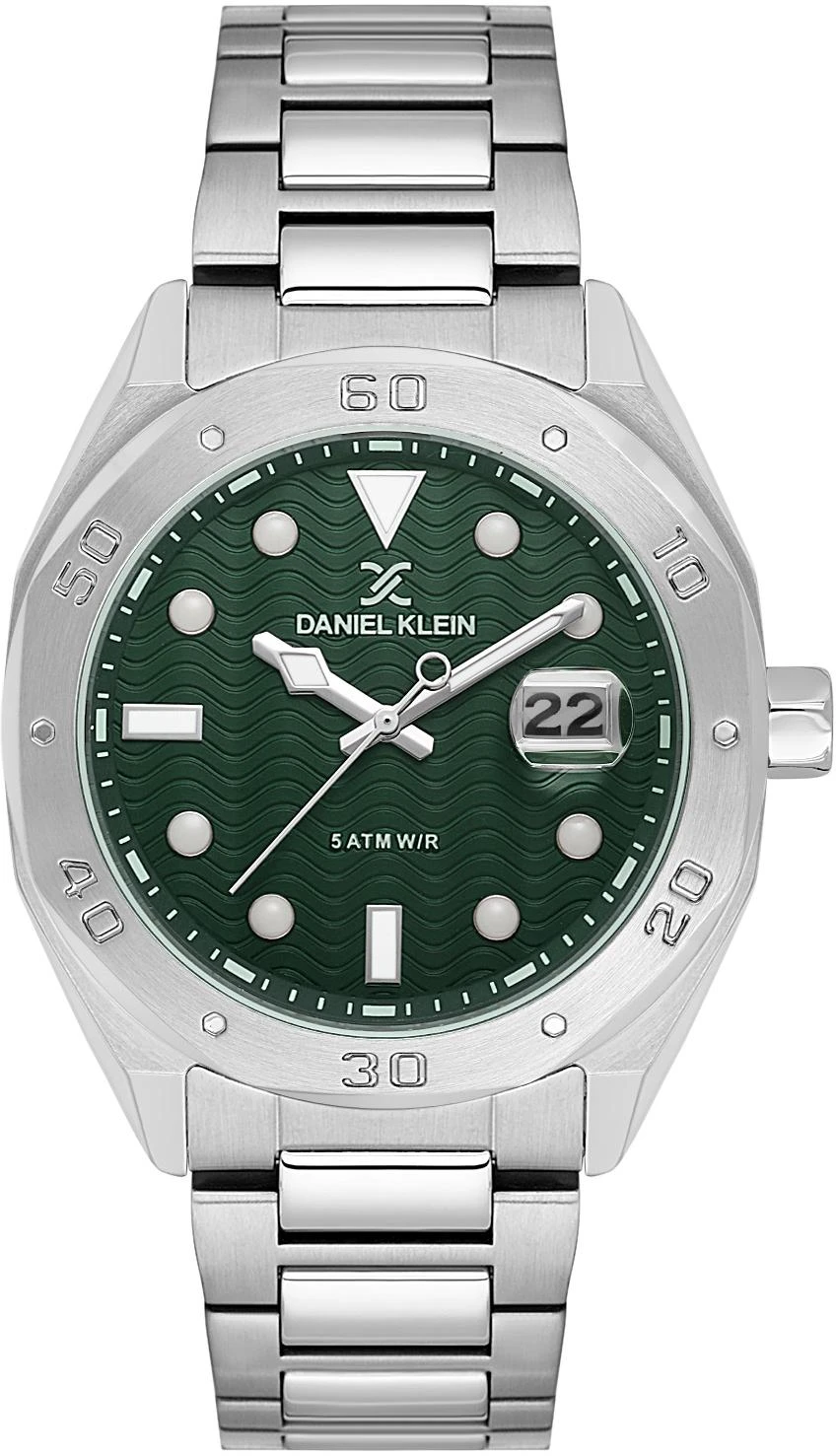 Мужские наручные часы Daniel Klein Premium 14076-2. Точный кварцевый механизм с аналоговой индикацией. В отличие от механических часов, не требуют завода и работают от батареи, показывая отклонение всего несколько секунд в месяц. На стрелки и отметки нанесен светонакопительный состав, благодаря этому считывать информацию с циферблата возможно и в темноте. Браслет из нержавеющей стали обладает высокой прочностью и износостойкостью, обеспечивая долговечность даже при активной эксплуатации. Материал устойчив к коррозии и сохраняет свой внешний вид надолго. Корпус изготовлен из высококачественной часовой латуни с высокими антикоррозийными свойствами. Прочное, устойчивое к царапинам минеральное стекло защищает часы от повреждений. Часы являются водонепроницаемыми до 5 Бар. Цвет корпуса: Серебристый. Цвет циферблата: Зеленый. Высота (с ушками): 45 мм. Толщина: 14 мм. Гарантия: 1 год.