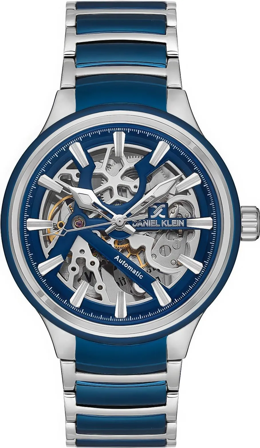 Мужские наручные часы Daniel Klein Skeleton 13657-3. Механические с автоподзаводом. Пружина механизма заводится автоматически благодаря естественным движениям владельца в процессе ежедневной носки часов. Браслет из нержавеющей стали. Латунный браслет. Прочное, устойчивое к царапинам минеральное стекло защищает часы от повреждений. Часы являются водонепроницаемыми до 5 Бар. Цвет циферблата: Серебристый. Цвет корпуса: Синий. На стрелки и отметки нанесен светонакопительный состав, благодаря этому считывать информацию с циферблата возможно и в темноте. Толщина: 13 мм. Гарантия: 2 года.