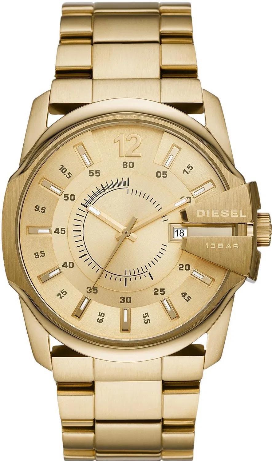 Мужские кварцевые часы из серии Master Chief. Круглый стальной корпус с PVD покрытием цвета золота. Золотистый циферблат. Минеральное стекло. Водозащита 100 м. Стальной браслет с PVD покрытием цвета золота. Раскладывающаяся застежка.