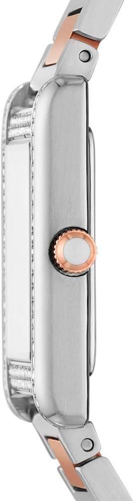 Emporio Armani Genni AR11626 — эта модель для тех, кто ценит изысканную геометрию. Прямоугольный стальной корпус с сияющим безелем, украшенным кристаллами, сочетается с нежным перламутровым циферблатом в обрамлении римских цифр. Изящная заводная головка с кабошоном подчеркивает внимание к деталям, а стальной браслет обеспечивает безупречную посадку на запястье. Эти часы — идеальный акцент для элегантного и современного образа.