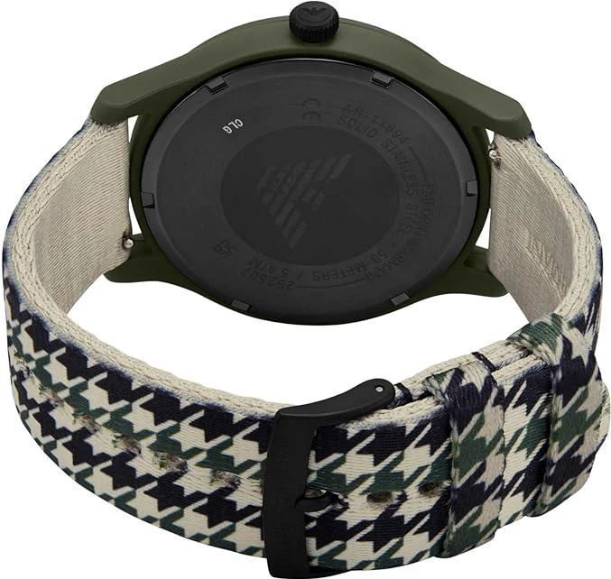 Эти 45-миллиметровые часы Emporio Armani выполнены с использованием материала #tide ocean material® — переработанного полимера, созданного из пластиковых отходов, собранных в океане. Модель отличается матовым темно-зеленым корпусом #tide, дополненным зеленым циферблатом с эффектом «солнечные лучи» (sunray) и трехцветным текстильным ремешком из того же экологичного материала #tide. Часы оснащены надежным трехстрелочным кварцевым механизмом, представляя собой идеальное сочетание современного стиля и заботы о планете. Водозащита 50 метров (5 АТМ/bar).