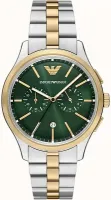 Мужские наручные часы Emporio Armani Ruggero AR11692. Точный кварцевый механизм с аналоговой индикацией. В отличие от механических часов, не требуют завода и работают от батареи, показывая отклонение всего несколько секунд в месяц. Браслет из нержавеющей стали обладает высокой прочностью и износостойкостью, обеспечивая долговечность даже при активной эксплуатации. Материал устойчив к коррозии и сохраняет свой внешний вид надолго. Функция хронографа. Отображение времени возможно в 12-часовом или 24-часовом формате. Корпус изготовлен из высококачественной нержавеющей стали 316L с высокими антикоррозийными свойствами. Прочное, устойчивое к царапинам минеральное стекло защищает часы от повреждений. Часы являются водонепроницаемыми до 5 Бар. Цвет корпуса: Серебристый. Цвет корпуса: Желтое золото. Цвет циферблата: Зеленый. Гарантия: 2 года.