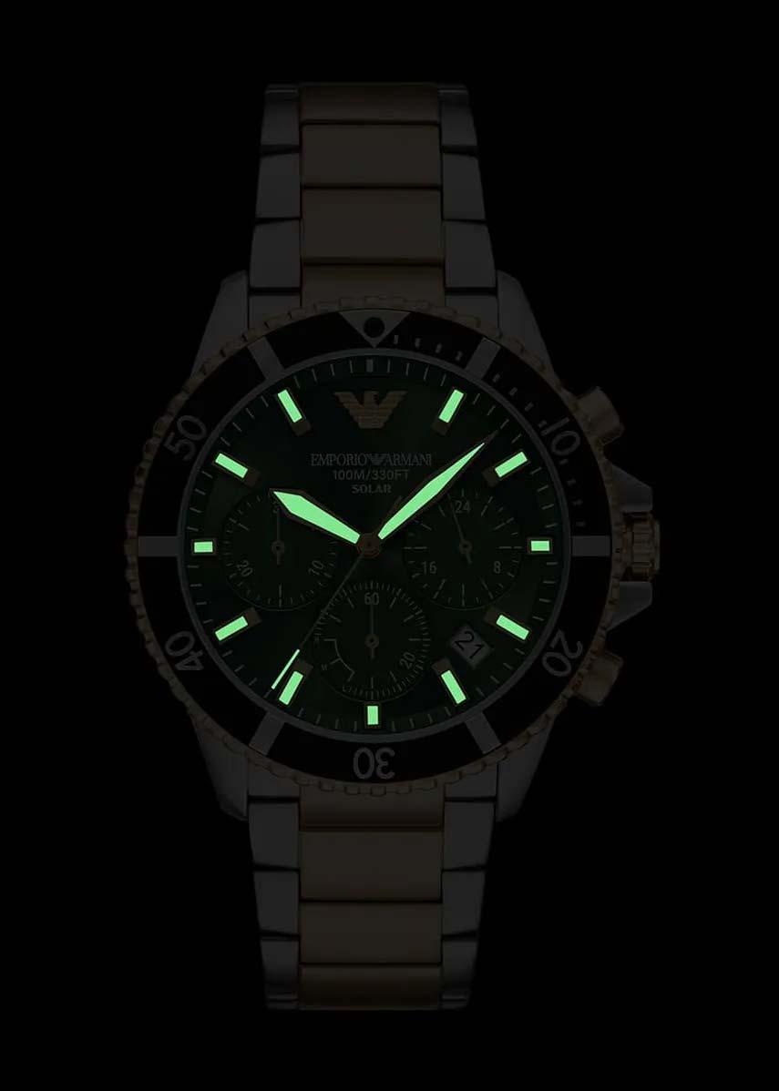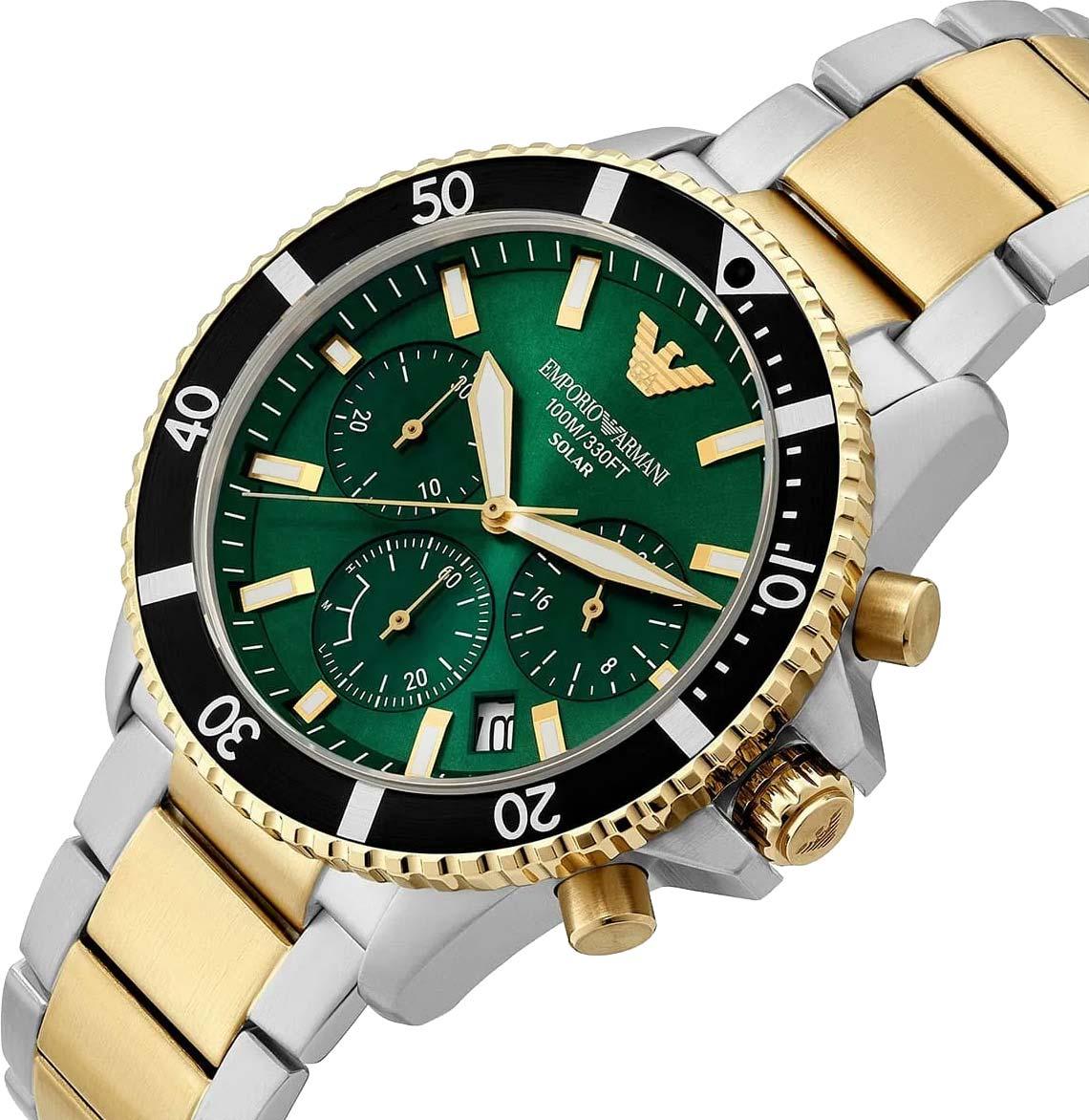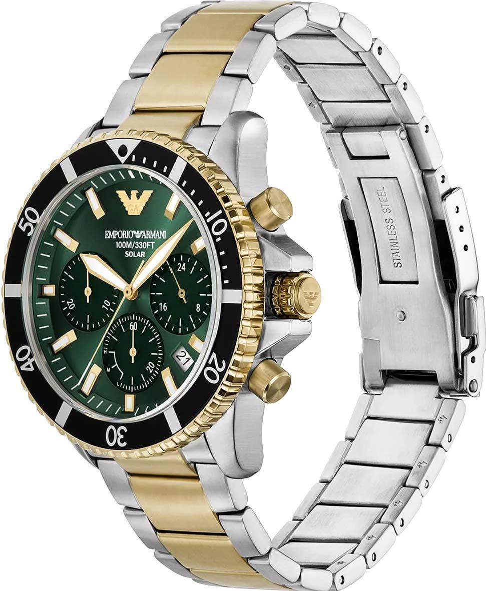 Мужские наручные часы Emporio Armani World Explorer AR11695. Точный кварцевый механизм с аналоговой индикацией. В отличие от механических часов, не требуют завода и работают от батареи, показывая отклонение всего несколько секунд в месяц. На стрелки и отметки нанесен светонакопительный состав, благодаря этому считывать информацию с циферблата возможно и в темноте. Браслет из нержавеющей стали обладает высокой прочностью и износостойкостью, обеспечивая долговечность даже при активной эксплуатации. Материал устойчив к коррозии и сохраняет свой внешний вид надолго. Функция хронографа. Солнечная батарейка. Солнечная подзаряжающаяся батарейка обеспечивает питание часов для работы. Отображение времени возможно в 12-часовом или 24-часовом формате. Корпус изготовлен из высококачественной нержавеющей стали 316L с высокими антикоррозийными свойствами. Сапфировое стекло. Искусственно изготовленное стекло с высокой прочностью и устойчивостью к царапинам. Часы являются водонепроницаемыми до 10 Бар. Цвет корпуса: Серебристый. Цвет корпуса: Черный. Цвет корпуса: Желтое золото. Цвет циферблата: Зеленый. Толщина: 13 мм. Гарантия: 2 года.