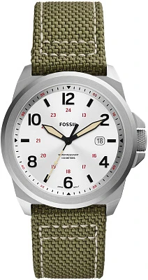 Мужские наручные часы Fossil Bronson FS5918. Точный кварцевый механизм с аналоговой индикацией. Ремешок изготовлен из кожи. Текстильный ремешок. Отображение времени возможно в 12-часовом или 24-часовом формате. Браслет из нержавеющей стали. Прочное, устойчивое к царапинам минеральное стекло защищает часы от повреждений. На циферблате отображается текущее число месяца. Часы являются водонепроницаемыми до 10 Бар. Цвет циферблата: Серебристый. Цвет корпуса: Серебристый. На стрелки и отметки нанесен светонакопительный состав, благодаря этому считывать информацию с циферблата возможно и в темноте. Толщина: 10 мм. Гарантия: 2 года.