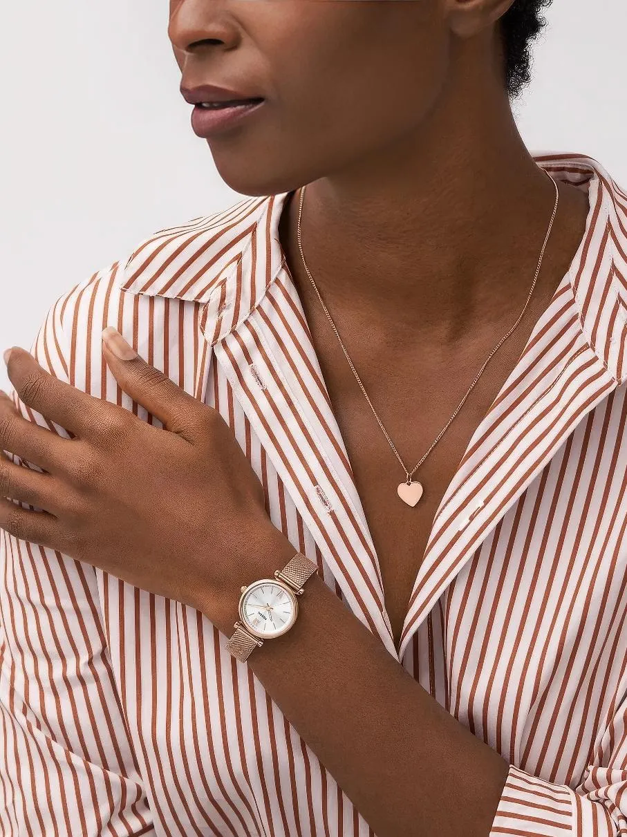 Женские наручные часы Fossil Carlie ES5314SET. Точный кварцевый механизм с аналоговой индикацией. Браслет из нержавеющей стали. Браслет из нержавеющей стали. Прочное, устойчивое к царапинам минеральное стекло защищает часы от повреждений. Часы являются водонепроницаемыми до 5 Бар. Цвет циферблата: Розовое золото. Цвет корпуса: Серебристый. На стрелки и отметки нанесен светонакопительный состав, благодаря этому считывать информацию с циферблата возможно и в темноте. Толщина: 10 мм. Гарантия: 2 года.
