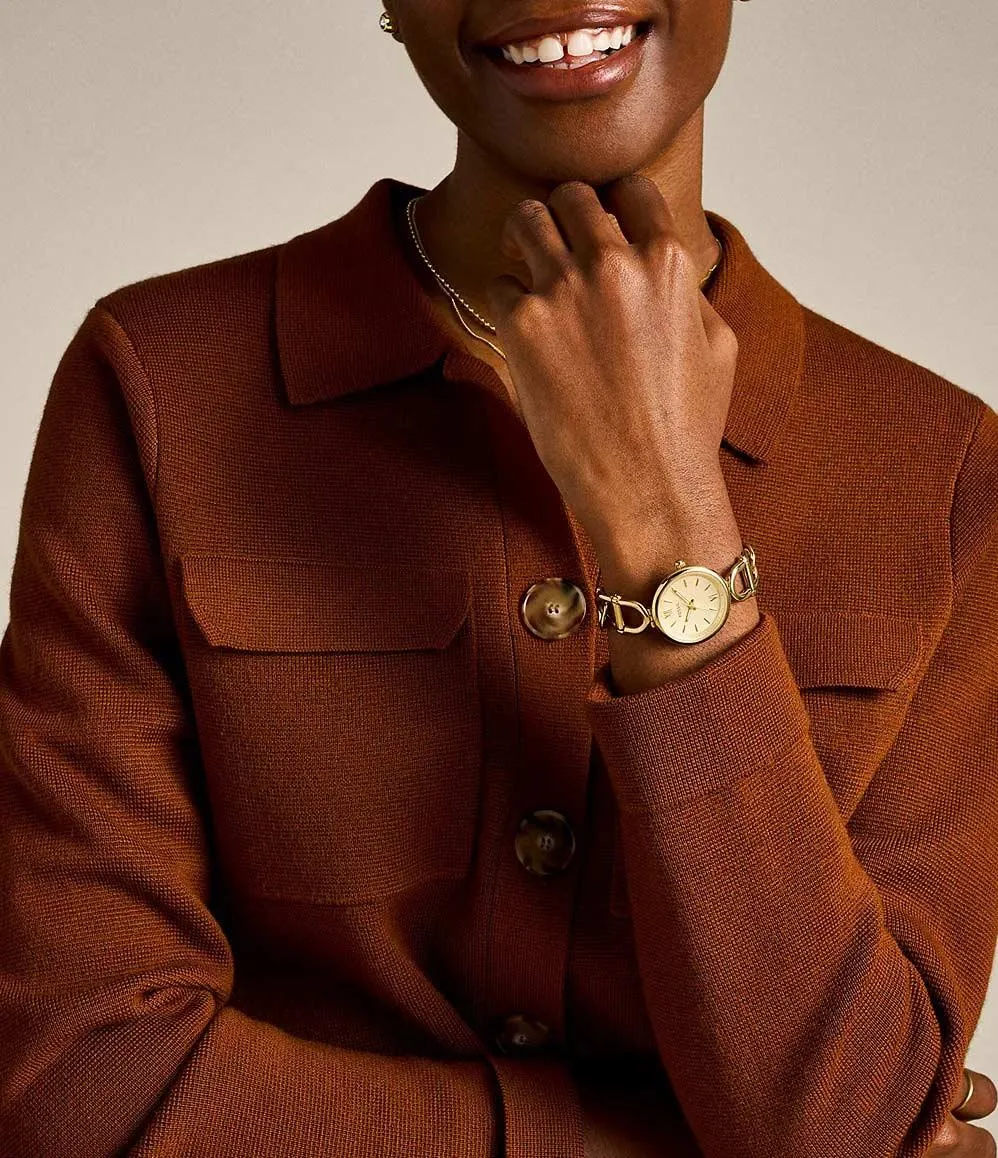 Женские наручные часы с круглым стальным корпусом в золотистом IP-покрытии сочетают в себе элегантность и функциональность. Модель оснащена точным кварцевым механизмом и золотистым циферблатом с классической разметкой: штрихами и римскими цифрами VI и XII. Люминесцентные стрелки обеспечивают хорошую видимость в условиях слабого освещения, а минеральное стекло надежно защищает циферблат от царапин. Стальной браслет в виде звеньев цепи с IP-покрытием и рифленая заводная головка дополняют продуманный дизайн. Благодаря водонепроницаемости 5 ATM (50 метров) часы устойчивы к брызгам, дождю и кратковременному погружению в воду, что делает их практичным аксессуаром для повседневной носки.
