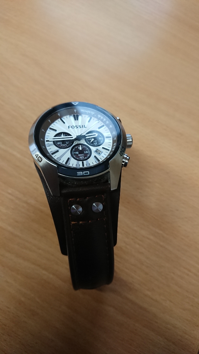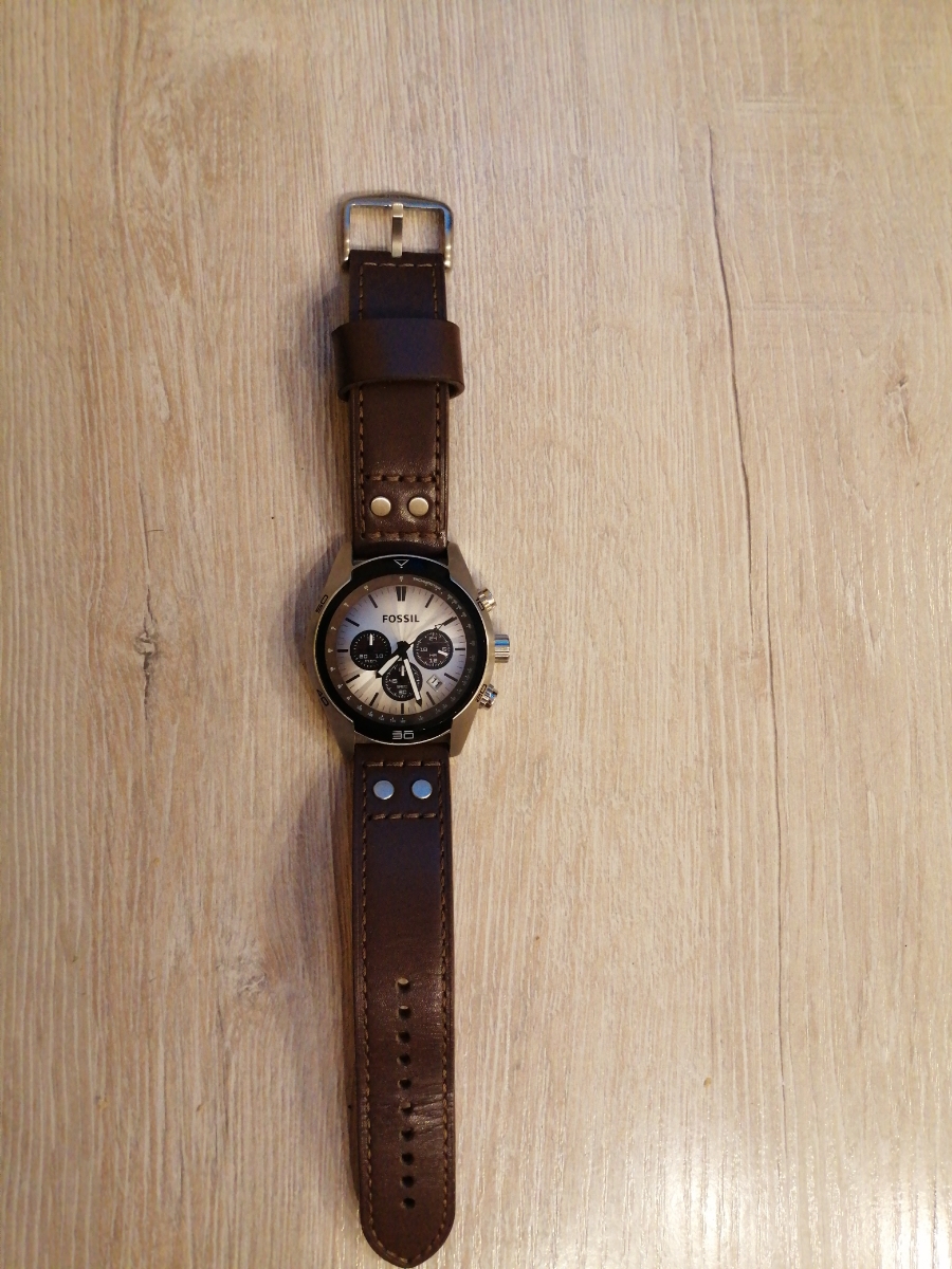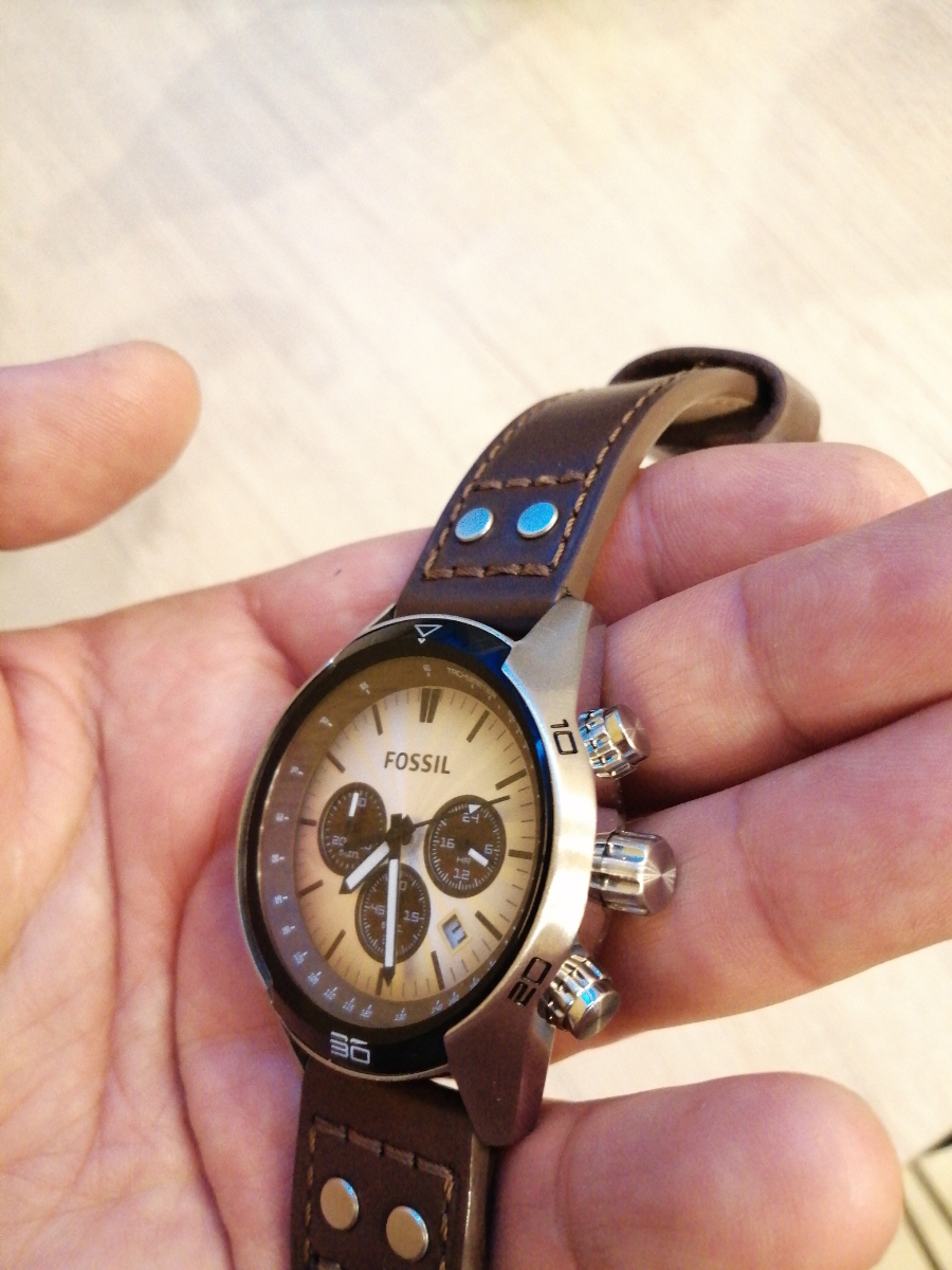 Мужские наручные часы, оснащённые хронографом с тахометрической шкалой, выполненные в спортивном стиле на широком кожаном ремешке коричневого цвета.