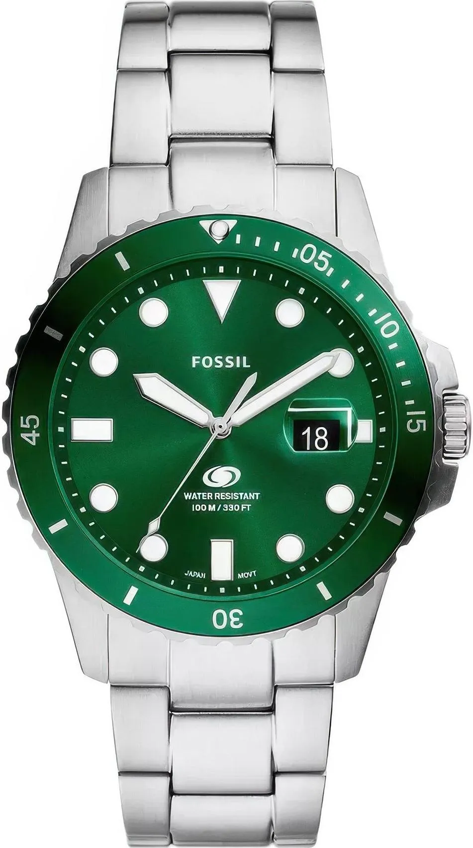 Мужские наручные часы Fossil Blue FS6033. Точный кварцевый механизм с аналоговой индикацией. Браслет из нержавеющей стали. Браслет из нержавеющей стали. Прочное, устойчивое к царапинам минеральное стекло защищает часы от повреждений. На циферблате отображается текущее число месяца. Часы являются водонепроницаемыми до 10 Бар. Цвет циферблата: Зеленый. Цвет циферблата: Серебристый. Цвет корпуса: Зеленый. На стрелки и отметки нанесен светонакопительный состав, благодаря этому считывать информацию с циферблата возможно и в темноте. Толщина: 12 мм. Гарантия: 2 года.