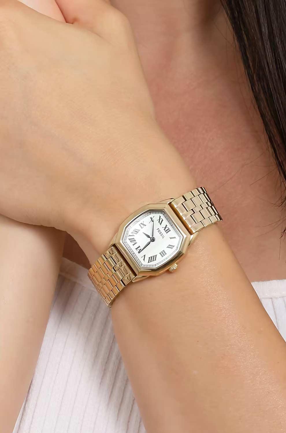 Женские часы с элегантным дизайном и стальным корпусом в покрытии желтое золото станут изысканным дополнением вашего образа. Модель с компактным 27-миллиметровым корпусом и белым циферблатом, украшенным узором "елочка" и римскими цифрами, сочетает в себе классическую эстетику и современные технологии. Надежный кварцевый механизм обеспечивает точность хода, а прочное минеральное стекло защищает циферблат от повреждений. Стальной браслет шириной 16 мм с раскладывающейся застежкой гарантирует комфортную посадку на запястье, а водонепроницаемость 3 ATM позволяет не снимать часы при повседневном контакте с водой.