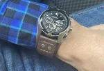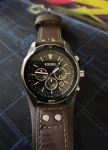Мужские часы с функцией хронографа, выполненные в спортивном стиле. Корпус из нерж. стали на широком кожаном ремешке. Циферблат с тахометрической шкалой. Точный кварцевый механизм с хронографом и индикацией времени суток в 24-часовом формате.