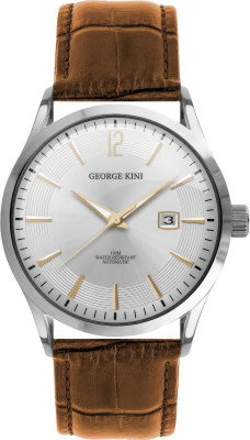 Мужские часы George Kini Advantage GK.19.S.1R.1.3.0. Механические с автоподзаводом. Пружина механизма заводится автоматически благодаря естественным движениям владельца в процессе ежедневной носки часов. Корпус изготовлен из высококачественной нержавеющей стали 316L с высокими антикоррозийными свойствами. На циферблате отображается текущее число месяца. Ремешок изготовлен из кожи. Минерально стекло с сапфировым антибликовым покрытием. Такое покрытие предотвращает появление царапин и повышает прочность стекла в несколько раз. Часы являются водонепроницаемыми до 10 Бар. Цвет корпуса: Серебристый. Цвет циферблата: Серебристый. Ширина (с заводной головкой): 41мм. Толщина: 9мм. В комплекте сменный ремешок. Гарантия: 2 года.