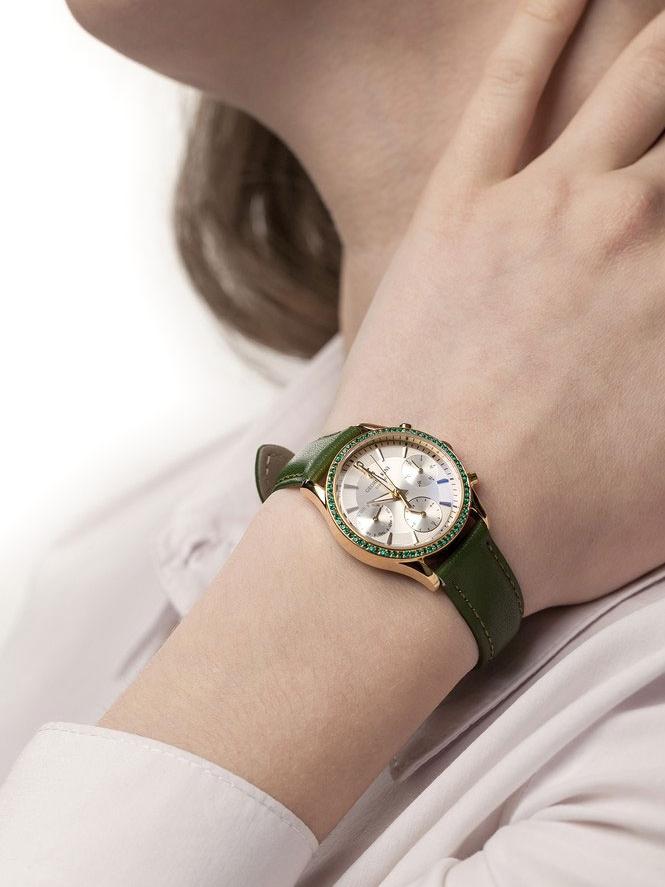 Яркие 72 чешских кристалла по безелю и бриллиант на циферблате добавят в ваш образ особую привлекательность. Наручные часы в круглом корпусе. Циферблат выполнен по технологии Sunray (солнечные лучи), в зоне меток - рельефный декоративный узор. Метки в виде штрихов, 12-ти часовая метка в виде арабской цифры. Стрелки в стиле Dauphine с люминесцентным покрытием, которое светится в темноте после непродолжительной зарядки на свету. 12-ти и 24-х часовой формат времени, дата и день недели отображаются на отдельных циферблатах. Рифленая заводная головка. Удобный ремешок из натуральной кожи с классической застежкой.