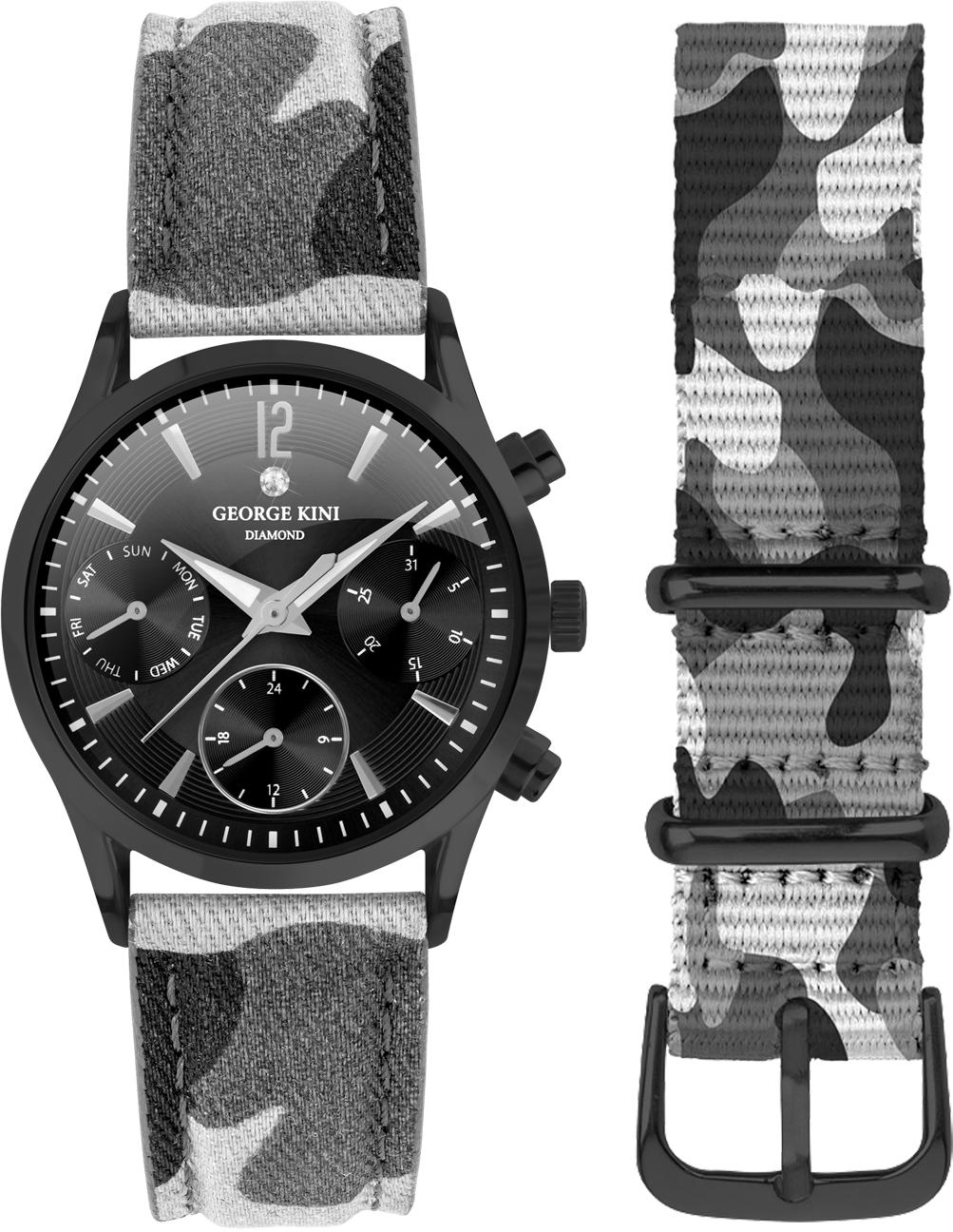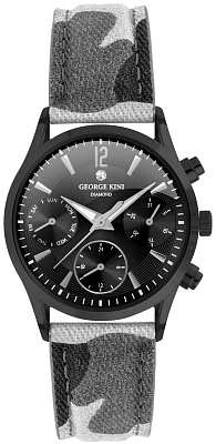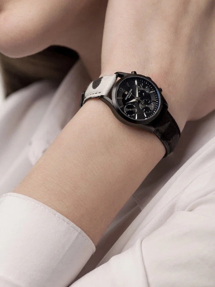 Эти часы предназначены для уверенных и целеустремленных женщин. Женские часы в круглом корпусе. Циферблат выполнен по технологии Sunray (солнечные лучи), в зоне меток - рельефный декоративный узор. Метки в виде штрихов, 12-ти часовая метка в виде арабской цифры. Стрелки в стиле Dauphine с люминесцентным покрытием, которое светится в темноте после непродолжительной зарядки на свету. 12-ти и 24-х часовой формат времени, дата и день недели отображаются на отдельных циферблатах. Рифленая заводная головка. Удобный текстильный ремешок, украшенный камуфляжным принтом, на кожаной основе с классической застежкой. В комплекте сменный нейлоновый ремешок.