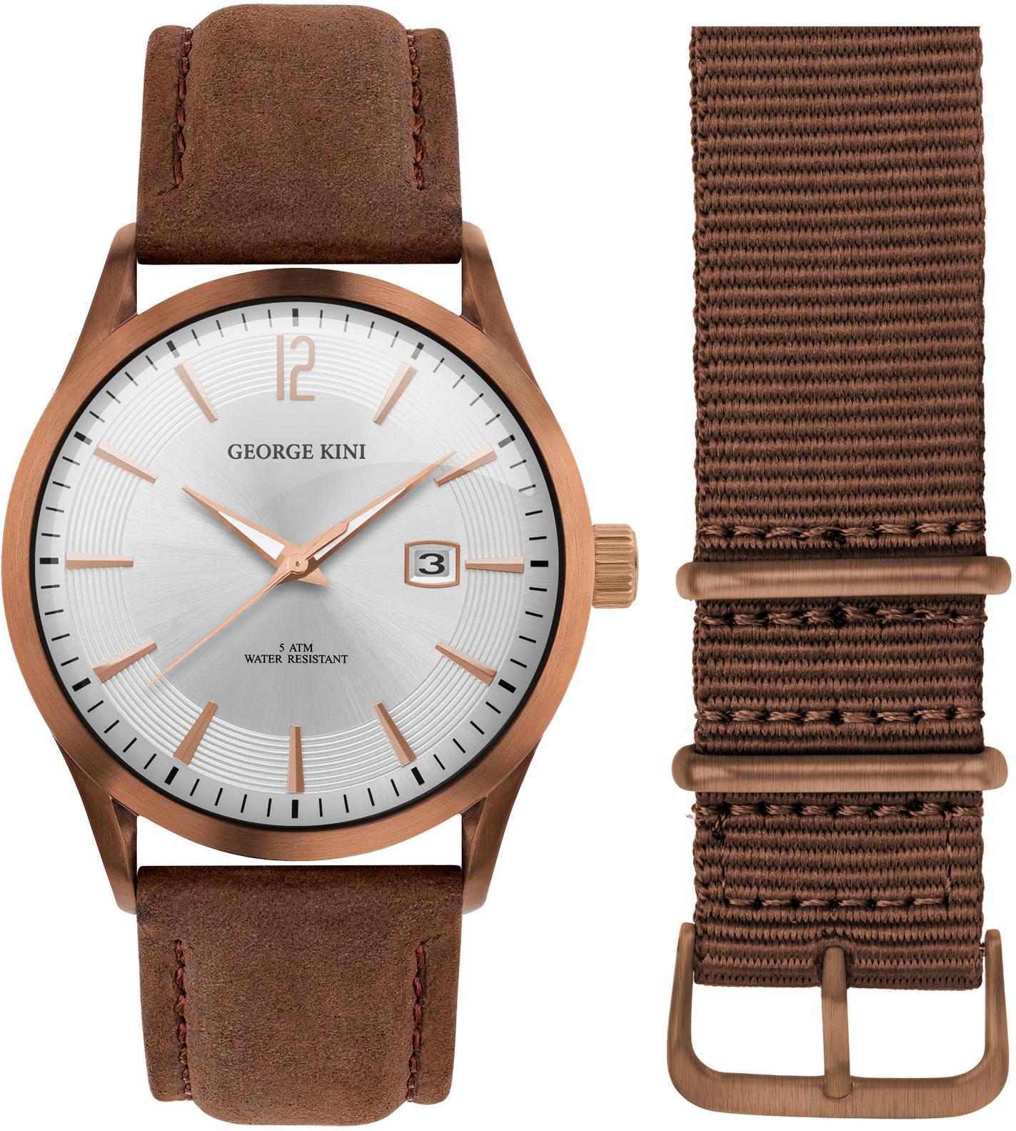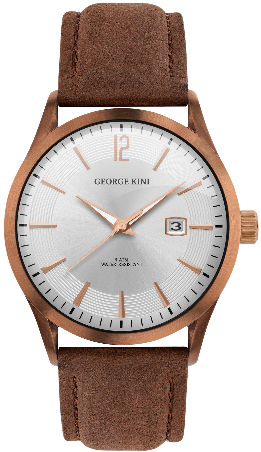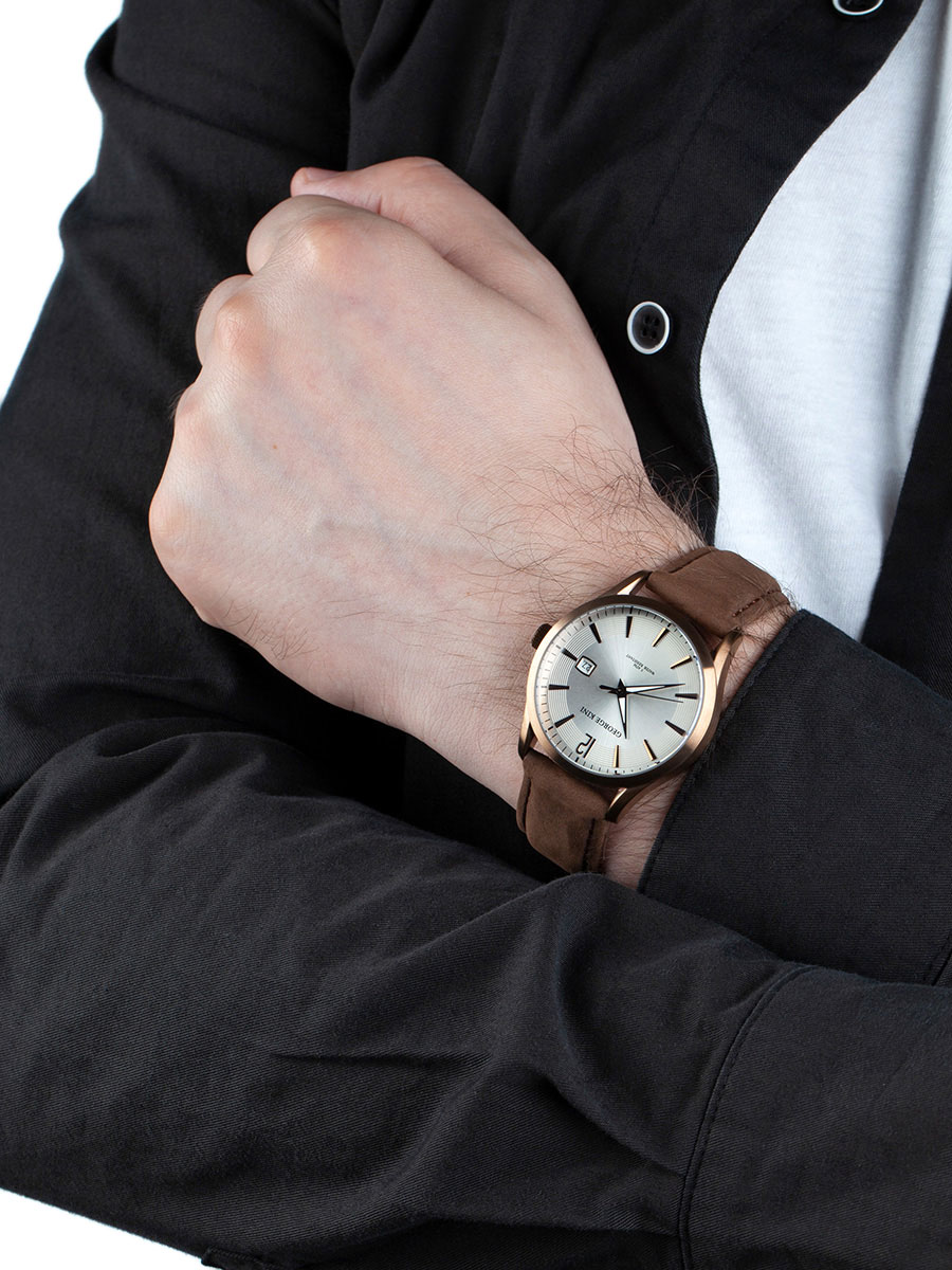 Этот шикарный аксессуар обладает простыми формами и сдержанным оформлением циферблата. Мужские часы в круглом корпусе из нержавеющей стали с эффектным бронзовым IP покрытием, подчеркивающим классический стиль. Циферблат выполнен по технологии Sunray (солнечные лучи), в зоне меток - рельефный декоративный узор. Метки в виде штрихов, 12-ти часовая метка в виде арабской цифры. Стрелки в стиле Dauphine с люминесцентным покрытием, которое светится в темноте после непродолжительной зарядки на свету. Окошко даты находится в положении 3 часа. Рифленая заводная головка. Удобный ремешок из натуральной бычьей кожи с классической застежкой. В комплекте сменный нейлоновый ремешок.