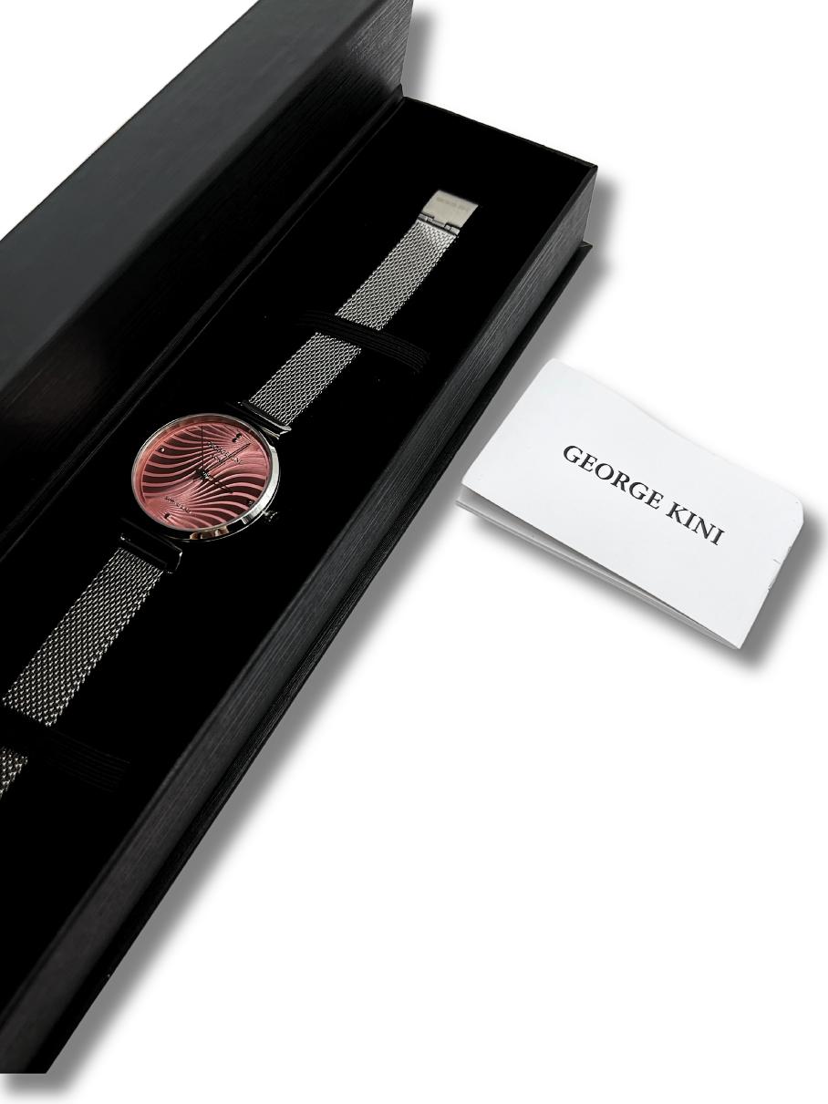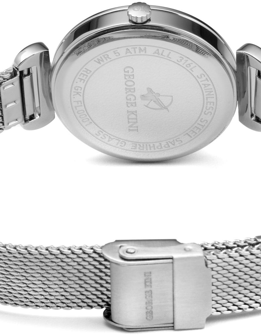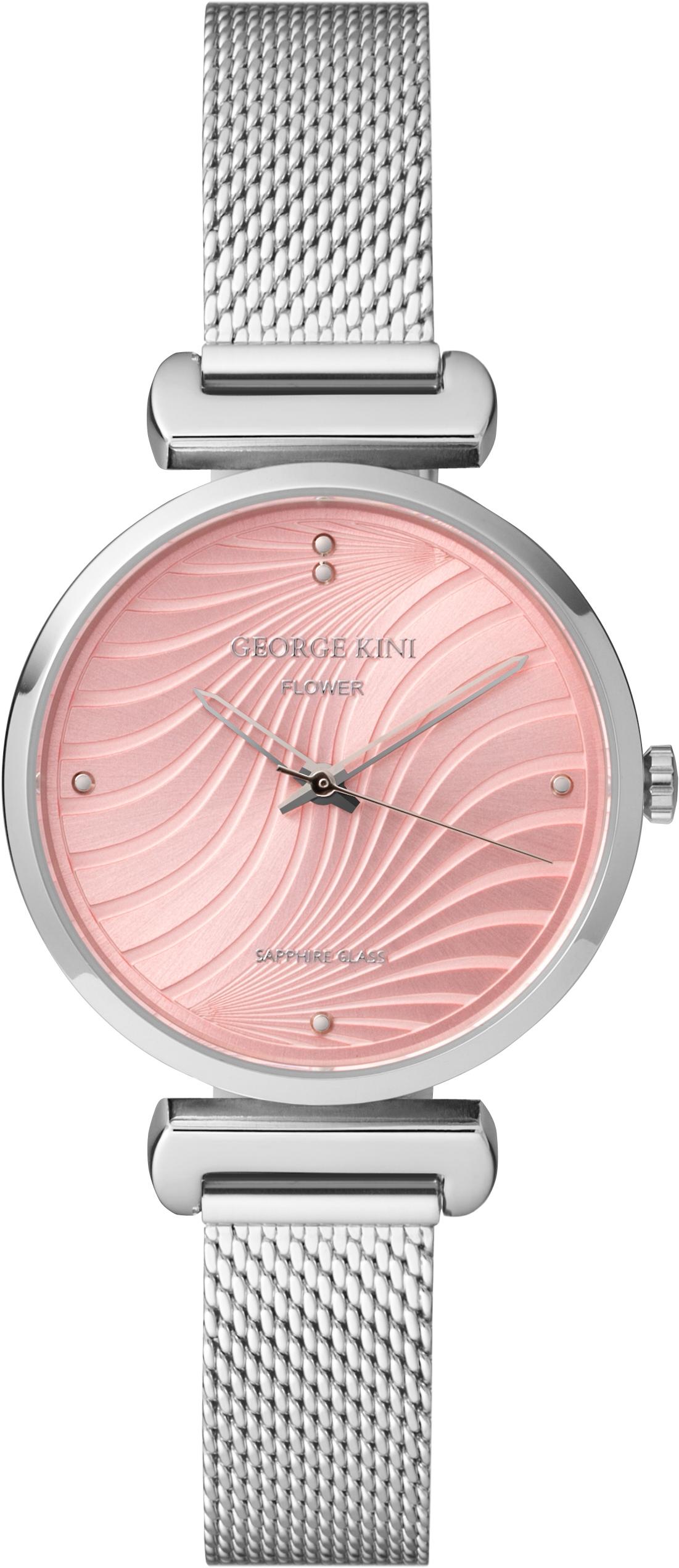 Женские часы George Kini Flower GK.FL0001. Точный кварцевый механизм с аналоговой индикацией. Корпус изготовлен из высококачественной нержавеющей стали 316L с высокими антикоррозийными свойствами. Браслет из нержавеющей стали. Минерально стекло с сапфировым антибликовым покрытием. Такое покрытие предотвращает появление царапин и повышает прочность стекла в несколько раз. Часы являются водонепроницаемыми до 5 Бар. Цвет корпуса: Серебристый. Цвет циферблата: Розовый. Ширина (с заводной головкой): 32мм. Толщина: 6мм. В комплекте сменный ремешок. Гарантия: 2 года.