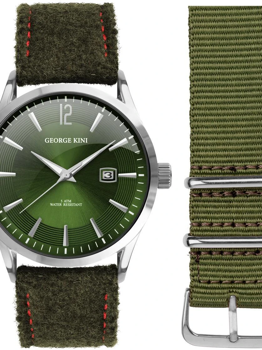 Необычный ремешок и классические черты - идеальный вариант часов для элегантного мужчины. Круглый полированный корпус. Циферблат выполнен по технологии Sunray (солнечные лучи), в зоне меток - рельефный декоративный узор. Метки в виде штрихов, 12-ти часовая метка в виде арабской цифры. Стрелки в стиле Dauphine с люминесцентным покрытием, которое светится в темноте после непродолжительной зарядки на свету. Окошко даты находится в положении 3 часа. Рифленая заводная головка. Удобный шерстяной ремешок на кожаной основе и классической застежкой. В комплекте сменный нейлоновый ремешок.