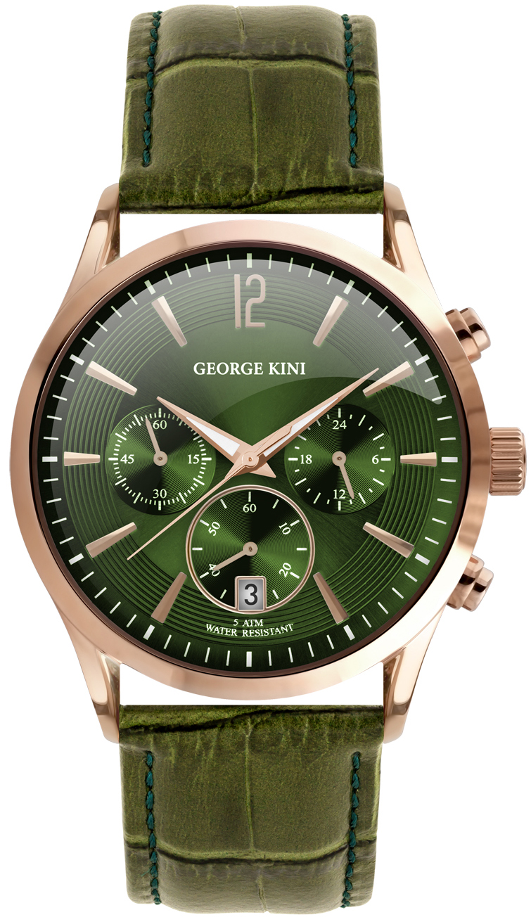 Мужские часы George Kini Khaki GK.17.R.5R.1.5.0. Точный кварцевый механизм с аналоговой индикацией. Корпус изготовлен из высококачественной нержавеющей стали 316L с высокими антикоррозийными свойствами. На циферблате отображается текущее число месяца. Функция хронографа. Отображение времени возможно в 12-часовом или 24-часовом формате. Ремешок изготовлен из кожи. Минерально стекло с сапфировым антибликовым покрытием. Такое покрытие предотвращает появление царапин и повышает прочность стекла в несколько раз. Часы являются водонепроницаемыми до 5 Бар. Цвет корпуса: Розовое золото. Цвет циферблата: Зеленый. Ширина (с заводной головкой): 41мм. Толщина: 9мм. Гарантия: 2 года.