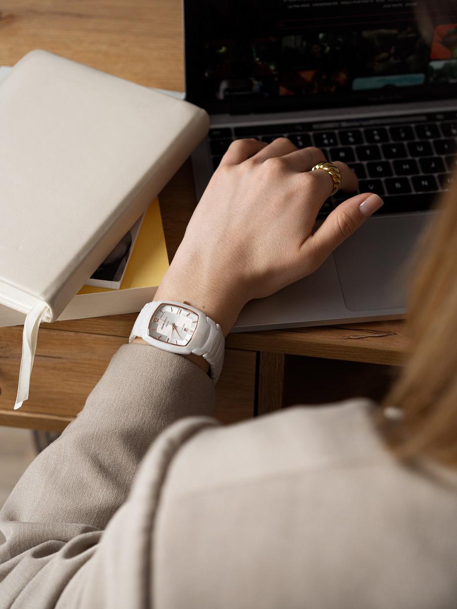 Представляем новинку бренда GEORGE KINI две модели из коллекции PASSION, которые являются воплощением изысканности и инновационного дизайна. Изготовленные из высококачественной керамики, они притягивают взгляды своим роскошным блеском и изяществом линий корпуса. Японский механизм гарантирует точность и надежность, а водонепроницаемость до 5 АТМ делает их практичными для повседневного использования. В новой коллекции представлены часы в двух цветовых вариациях: белые и черные, подходящие под любой стиль, будь это деловая встреча или вечер в компании друзей, Вы будете выглядеть в них великолепно. Выбор этих часов говорит о высоком чувстве стиля и предпочтении качества, и они будут служить не только надежным инструментом для измерения времени, но и ключевым элементом в создании неповторимого образа современной женщины.