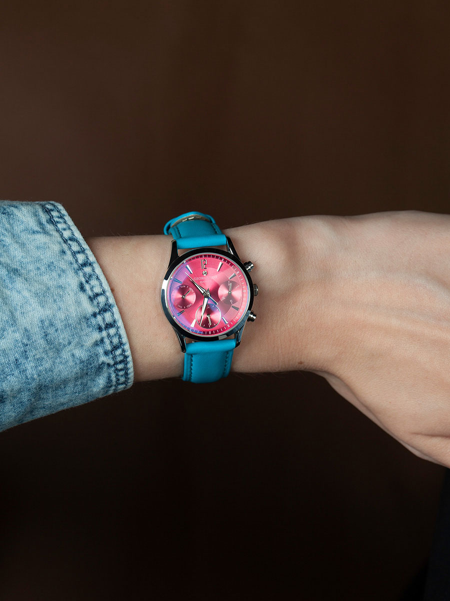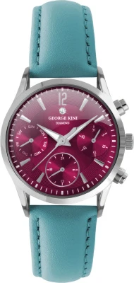 Мультифункциональные часы идеально украсят нежный женский образ. Женские кварцевые часы в круглом корпусе. Безель украшен паве из сверкающих кристаллов. Циферблат выполнен по технологии Sunray (солнечные лучи), украшен рельефным декоративным узором в зоне меток и бриллиантом в положении 12 часов. Метки в виде штрихов, 12-ти часовая метка в виде арабской цифры. 12-ти и 24-х часовой формат времени, дата и день недели отображаются на отдельных циферблатах. Стрелки в стиле Dauphine с люминесцентным покрытием, которое светится в темноте после непродолжительной зарядки на свету. Рифленая заводная головка. Удобный ремешок из натуральной кожи с классической застежкой.