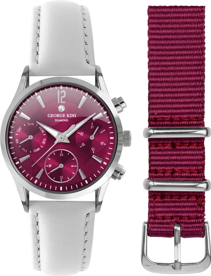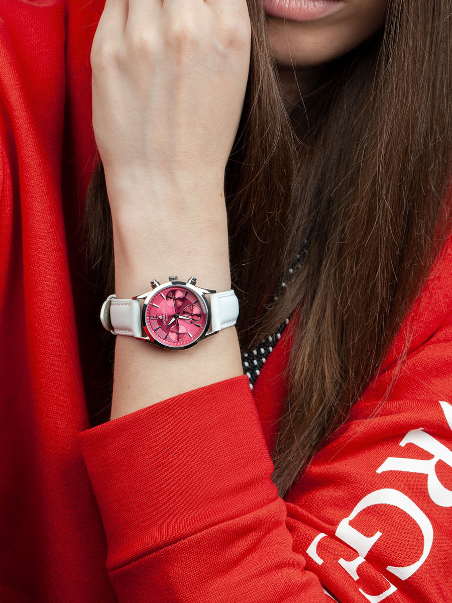 Мультифункциональные часы идеально украсят нежный женский образ. Женские кварцевые часы в круглом корпусе. Безель украшен паве из сверкающих кристаллов. Циферблат выполнен по технологии Sunray (солнечные лучи), украшен рельефным декоративным узором в зоне меток и бриллиантом в положении 12 часов. Метки в виде штрихов, 12-ти часовая метка в виде арабской цифры. 12-ти и 24-х часовой формат времени, дата и день недели отображаются на отдельных циферблатах. Стрелки в стиле Dauphine с люминесцентным покрытием, которое светится в темноте после непродолжительной зарядки на свету. Рифленая заводная головка. Удобный ремешок из натуральной кожи с классической застежкой. В комплекте сменный нейлоновый ремешок.