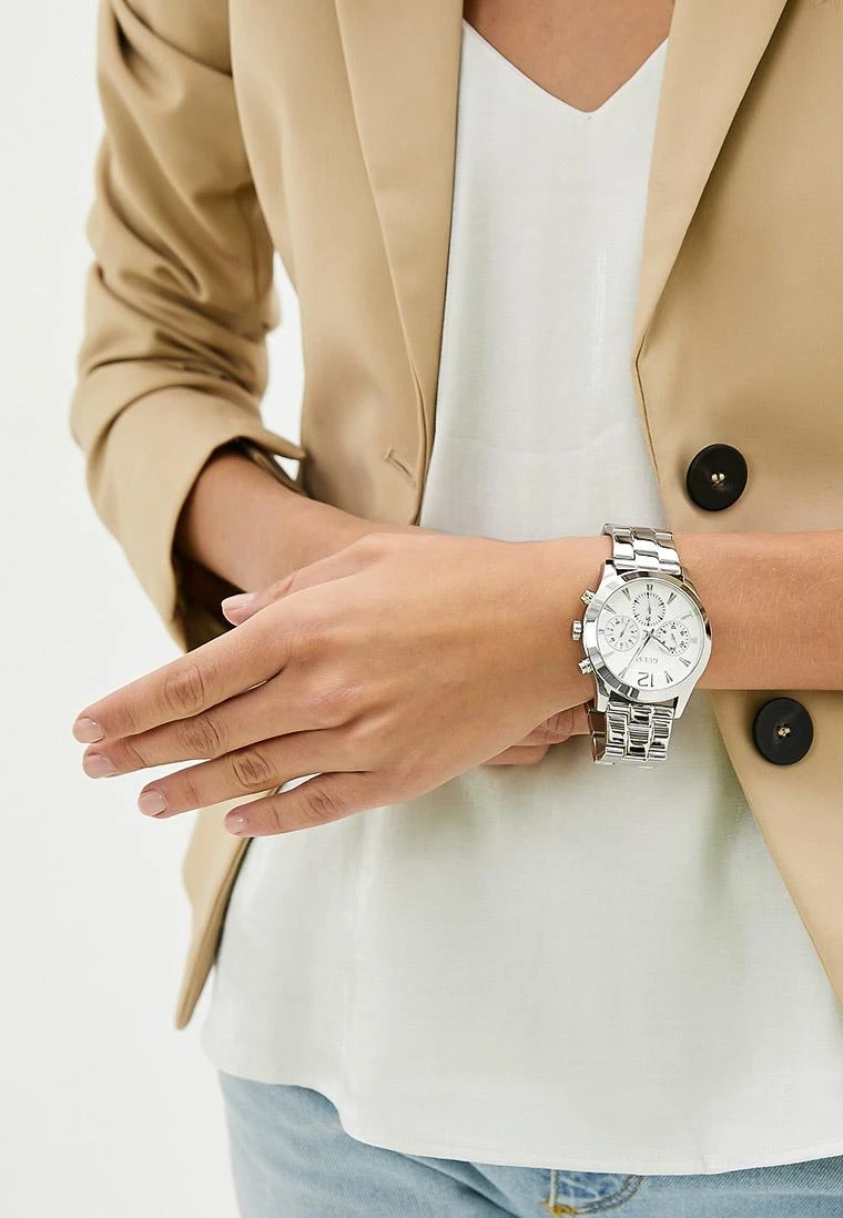 <b>Женские кварцевые часы из серии Skylar. Круглый стальной корпус. Белый циферблат с отдельными перламутровыми циферблатами для даты, суточника и дня недели. Минеральное стекло. Водозащита 30 м. Стальной браслет с раскладывающейся застежкой.</b><br><br>• Точный кварцевый механизм.<br>• Центральные часовая, минутная и секундная стрелки.<br>• Точность хода не хуже от -10 до +20 сек. в месяц.<br>• Стрелочный указатель дня недели.<br>• Стрелочный указатель времени суток с 24-х часовой шкалой.<br>• Стрелочный указатель даты.<br>• Минеральное стекло устойчивое к возникновению царапин.<br>• Светонакопительный состав на стрелках.<br>• Корпус из стального сплава 316L с высокими антикоррозийными свойствами.<br>• Белый циферблат с отдельными перламутровыми циферблатами для даты, суточника и дня недели.<br>• Водозащита до 3 АТМ.<br>• Регулируемый по длине браслет из нержавеющей стали.<br>• Надежный браслетный замок с тройным сгибом.