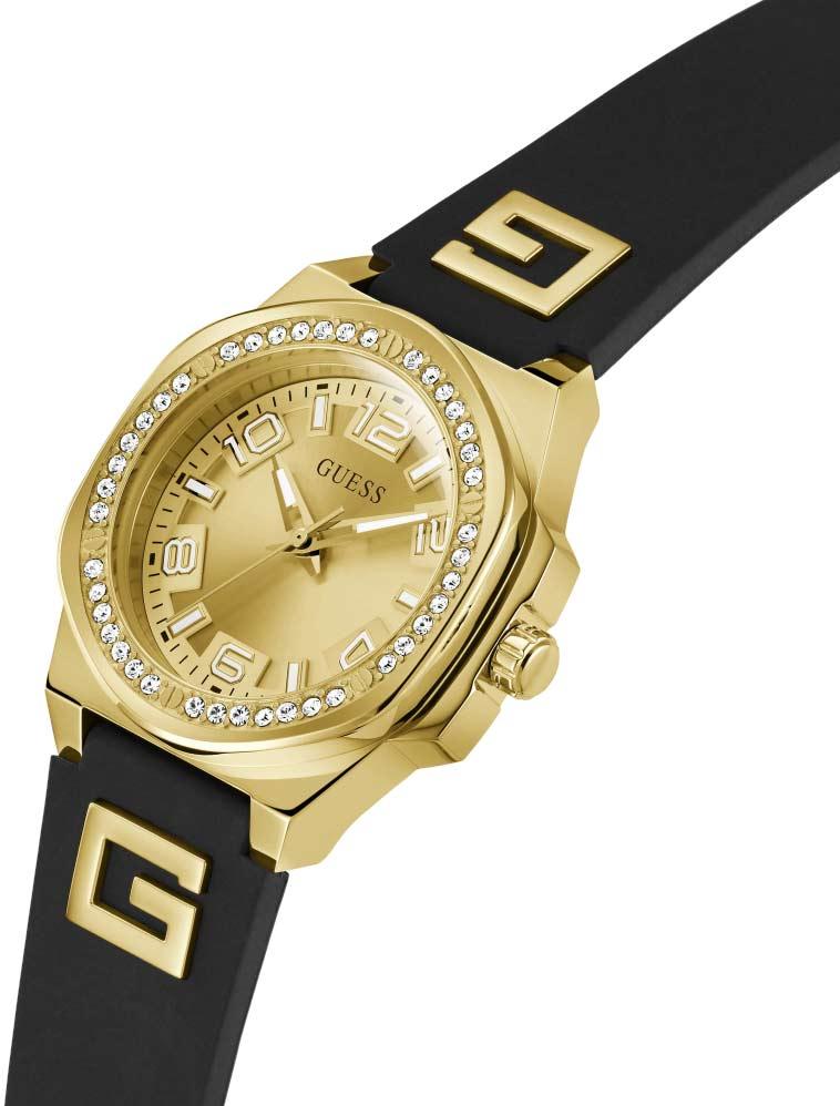 Яркий аксессуар в спортивном стиле — женские наручные часы со стальным корпусом, созданные для поклонниц активного образа жизни. Модель отличается безелем, украшенным декоративными винтами и кристаллами, и циферблатом, выполненным по технологии Sunray с метками в виде штрихов и арабских цифр. Часы оснащены рифленой заводной головкой с защитой и комплектуются силиконовым ремешком с классической застежкой.