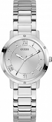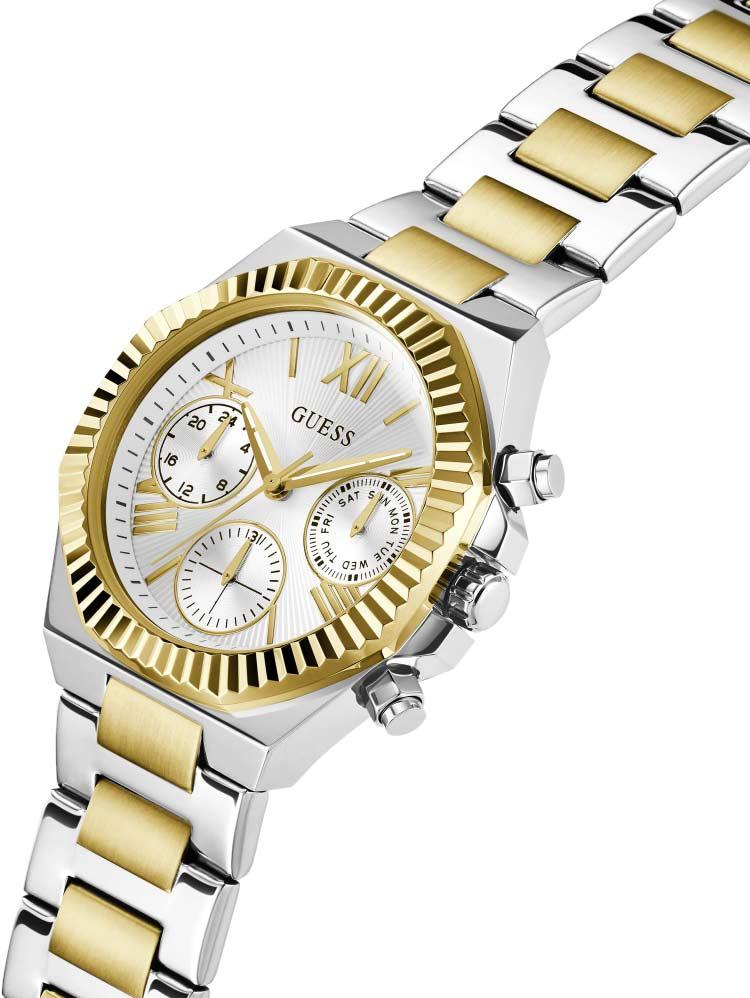 Женские наручные часы со стальным корпусом. Рифленый безель. 12-ти и 24-х часовой формат времени. Циферблат выполнен по технологии Sunray (солнечные лучи). Метки в виде штрихов и римских цифр. Время в 24-х часовом формате, дата и день недели вынесены на отдельные циферблаты. Рифленая заводная головка с защитой. Браслет с раскладывающейся застежкой. Водозащита 50 метров (5 АТМ/bar): выдерживают мытье рук, попадание крупных капель.