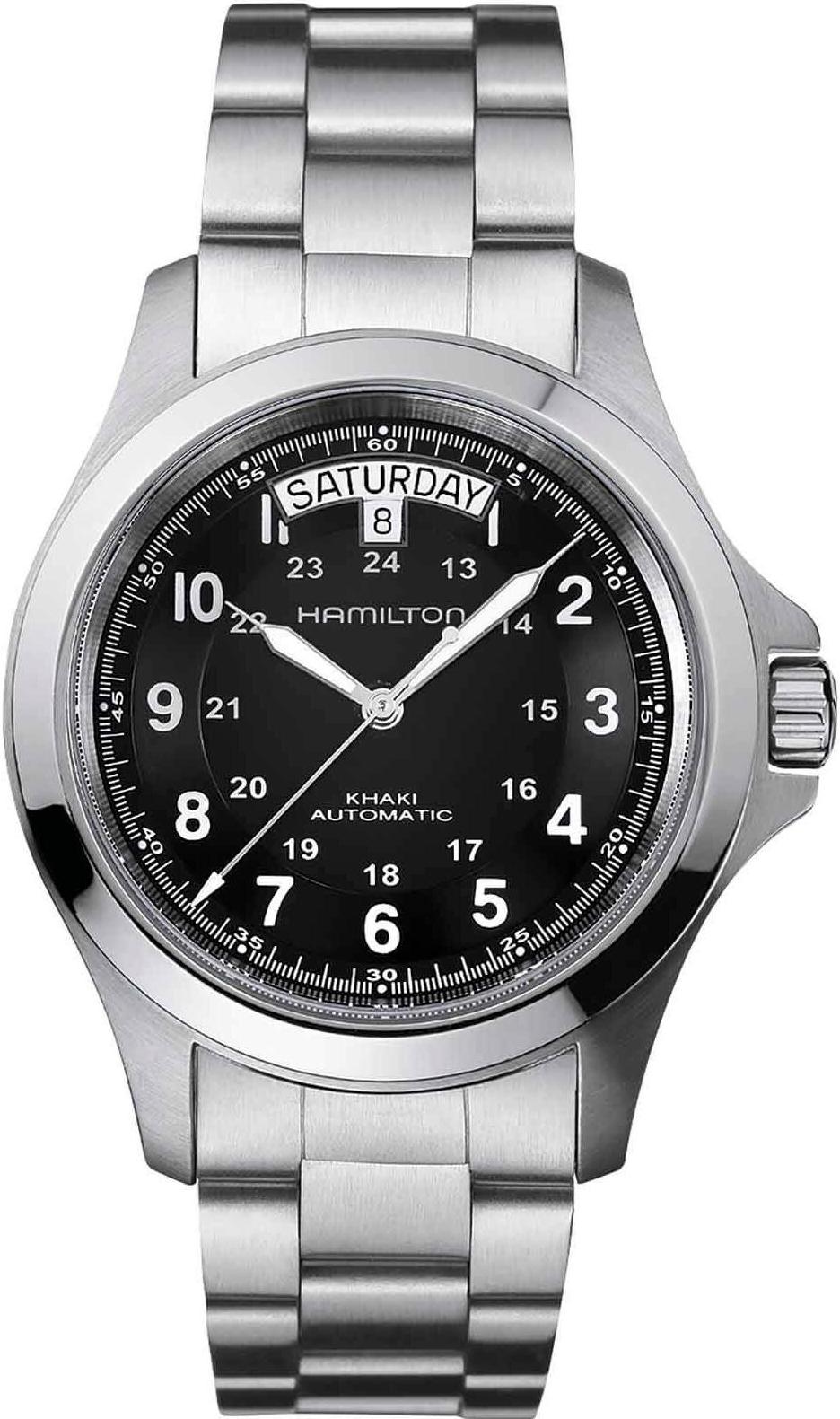 Hamilton Мужские швейцарские часы Khaki Aviation H64455133. Механические с автоподзаводом. Пружина механизма заводится автоматически благодаря естественным движениям владельца в процессе ежедневной носки часов. Браслет из нержавеющей стали. После настройки автоматический календарь всегда отображает точную дату. Отображение времени возможно в 12-часовом или 24-часовом формате. Корпус изготовлен из высококачественной нержавеющей стали 316L с высокими антикоррозийными свойствами. Сапфировое стекло. Искусственно изготовленное стекло с высокой прочностью и устойчивостью к царапинам. Часы являются водонепроницаемыми до 5 Бар. Цвет циферблата: Серебристый. Цвет корпуса: Черный. На стрелки и отметки нанесен светонакопительный состав, благодаря этому считывать информацию с циферблата возможно и в темноте. Толщина: 11 мм. Гарантия: 2 года.