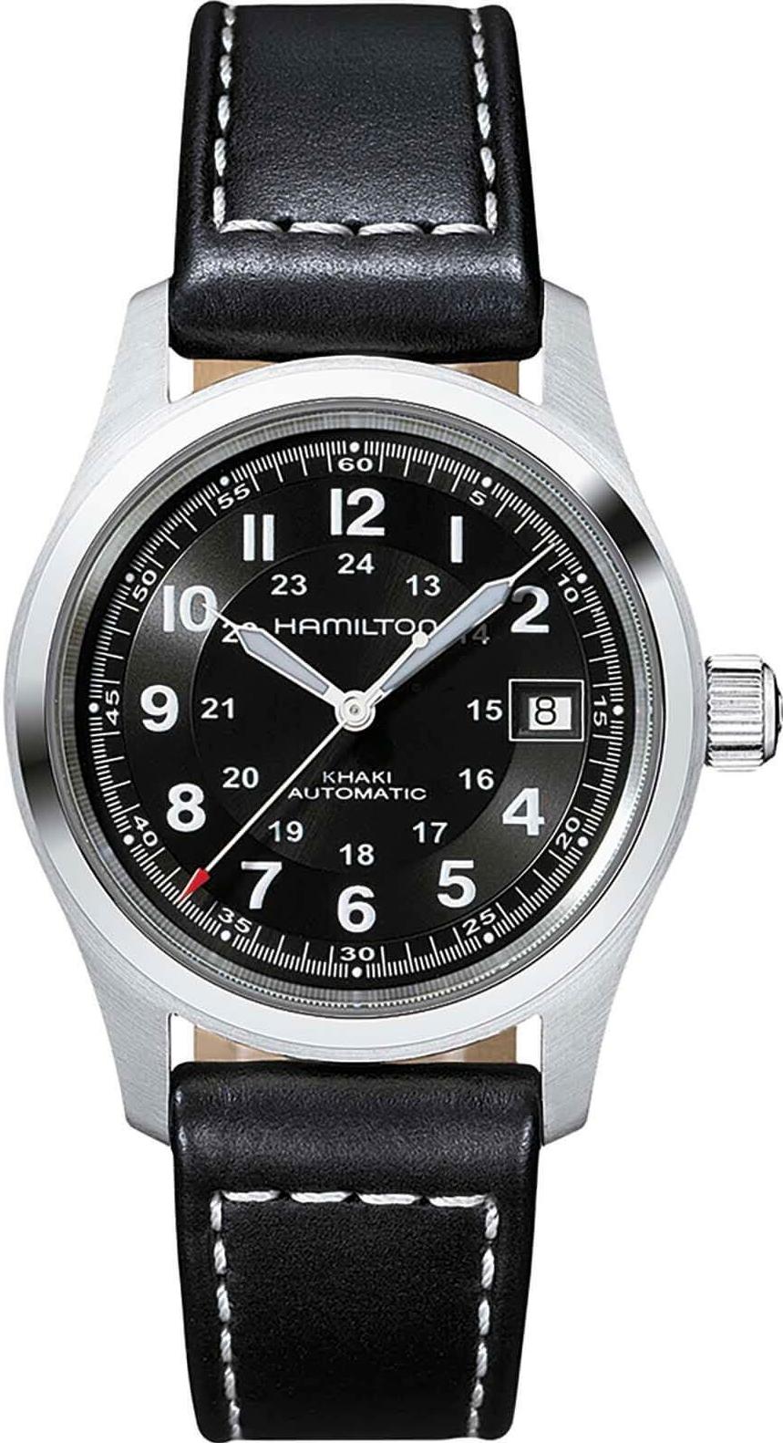 Hamilton Мужские швейцарские часы Khaki Field H70455733. Механические с автоподзаводом. Пружина механизма заводится автоматически благодаря естественным движениям владельца в процессе ежедневной носки часов. Ремешок изготовлен из кожи. После настройки автоматический календарь всегда отображает точную дату. Отображение времени возможно в 12-часовом или 24-часовом формате. Корпус изготовлен из высококачественной нержавеющей стали 316L с высокими антикоррозийными свойствами. Сапфировое стекло. Искусственно изготовленное стекло с высокой прочностью и устойчивостью к царапинам. Часы являются водонепроницаемыми до 10 Бар. Цвет циферблата: Черный. Цвет корпуса: Серебристый. На стрелки и отметки нанесен светонакопительный состав, благодаря этому считывать информацию с циферблата возможно и в темноте. Толщина: 12 мм. Гарантия: 2 года.