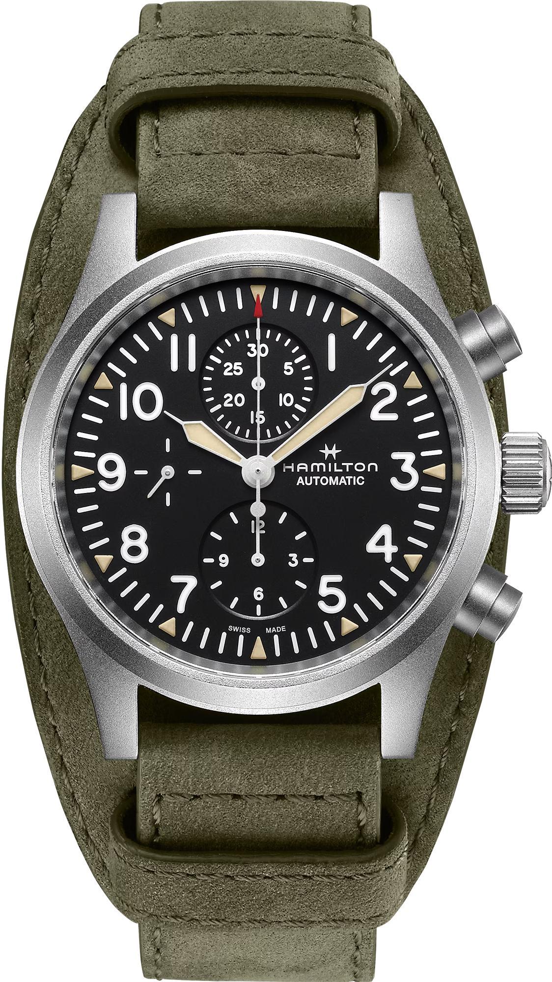 Прочная, надежная и точная модель Khaki Field Automatic Chronograph идеально подойдет для уверенных в себе путешественников. Специальная гравировка на задней крышке этих армейских часов в корпусе из нержавеющей стали с пескоструйной обработкой диаметром 44 мм отдает должное военному наследию Hamilton. Идеально фиксирующий все временные отрезки эксклюзивный автоматический калибр хронографа H-21 с запасом хода в 60 часов наделяют модель универсальным характером.